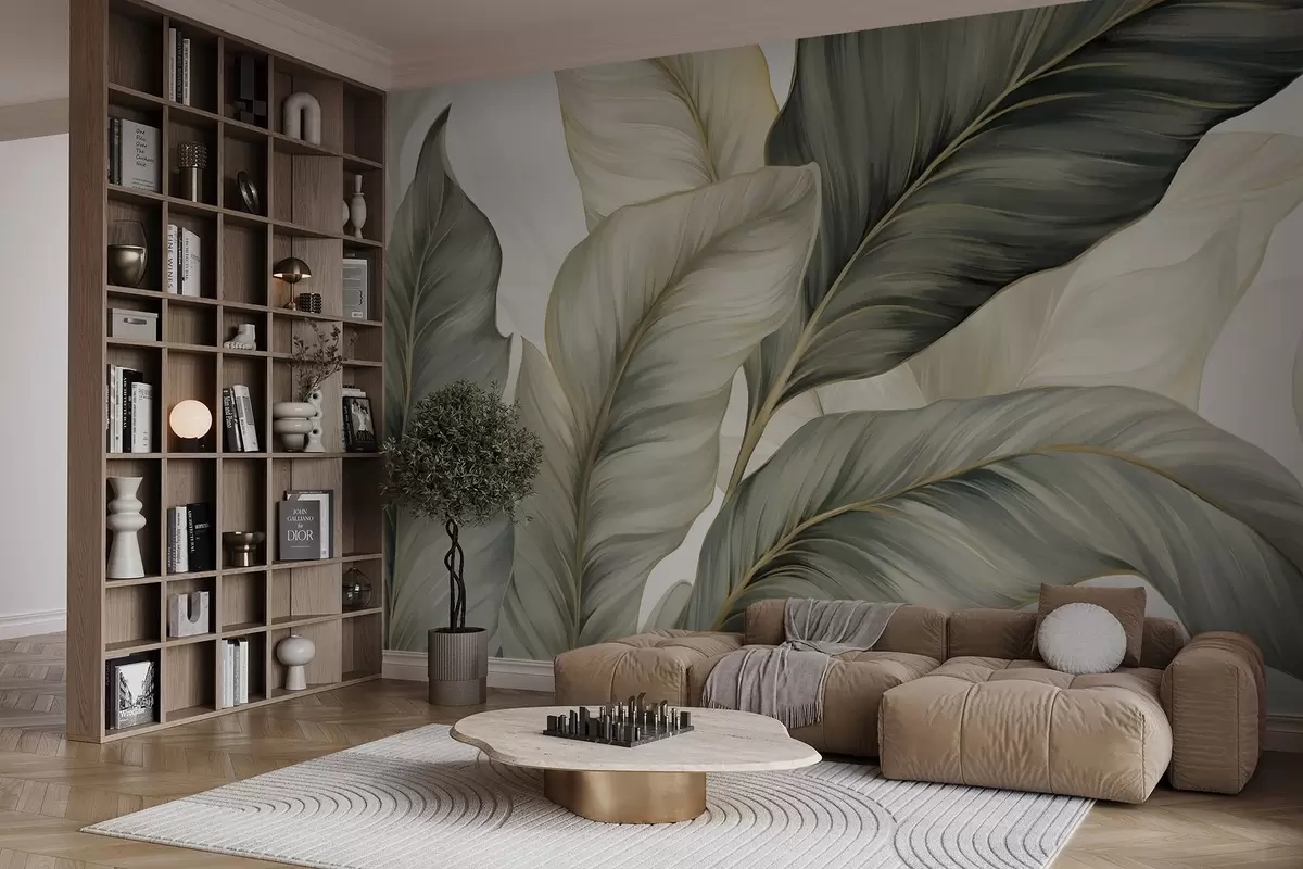 Fototapeten Große, stilisierte, strukturierte Blätter mit detaillierten Adern in verschiedenen Grün-, Creme- und Beigetönen N° w08785