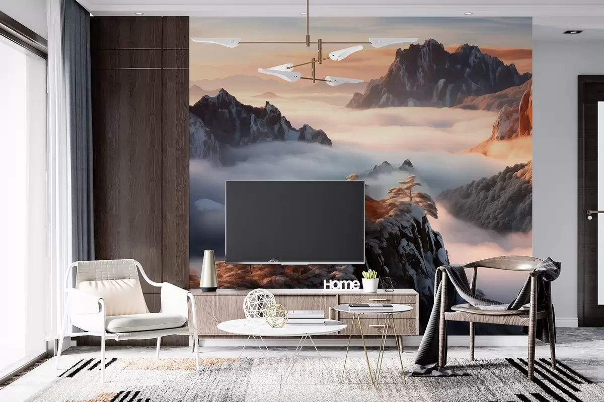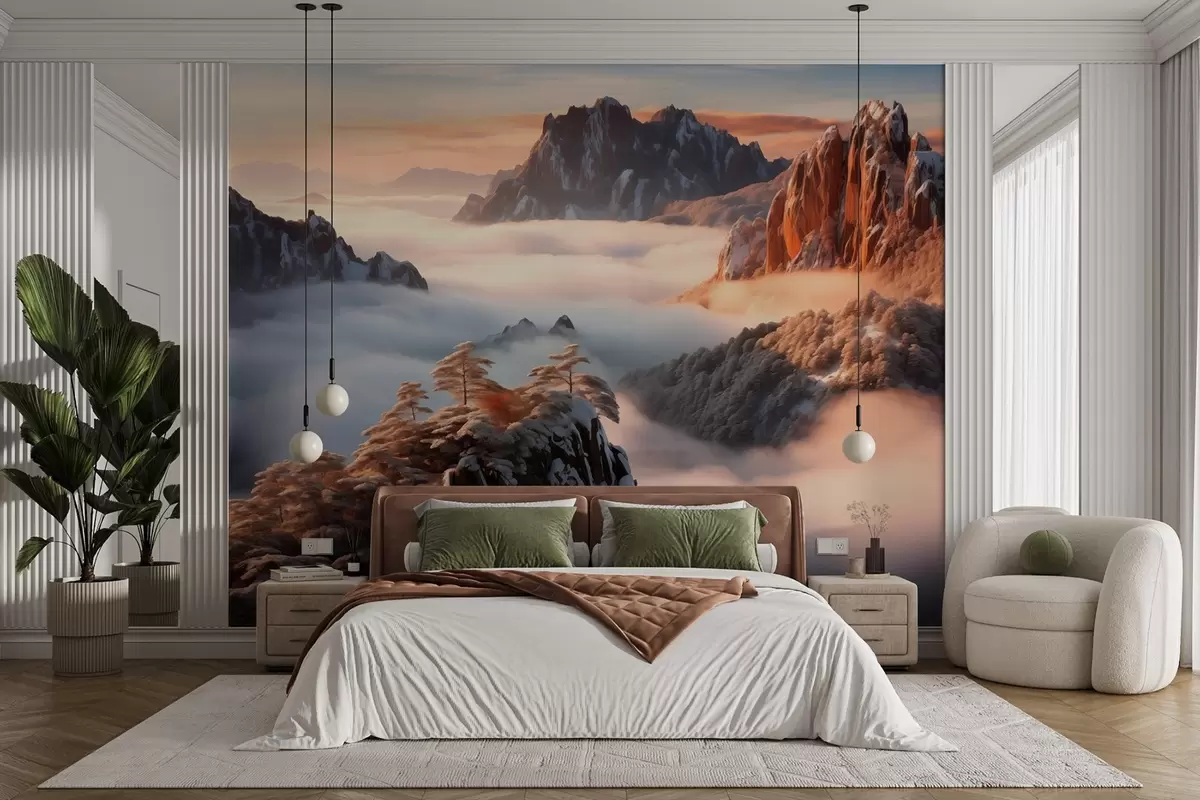Fototapeten Charmante Berglandschaft mit Nebel und Bäumen N° w08807