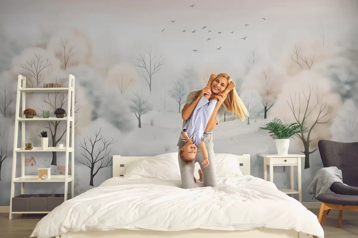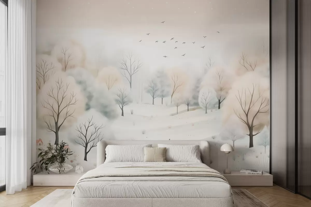 Fototapeten Winterwald mit Bäumen, kleinen Häusern, Vögeln und Schnee in einem leichten Aquarellstil N° w08815