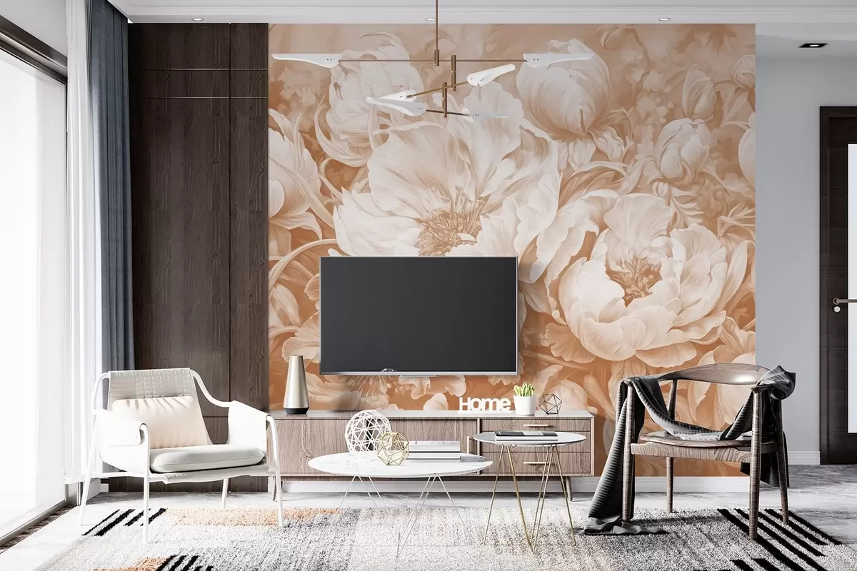 Fototapeten Tulpen und Pfingstrosen, eine florale Komposition in beigem Ölpinselstrich-Stil N° w08817v1