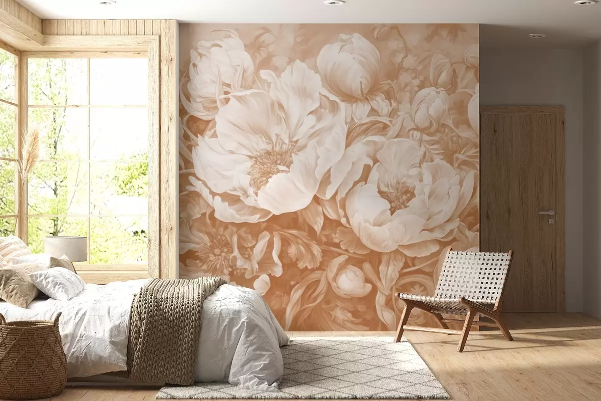 Fototapeten Tulpen und Pfingstrosen, eine florale Komposition in beigem Ölpinselstrich-Stil N° w08817v1