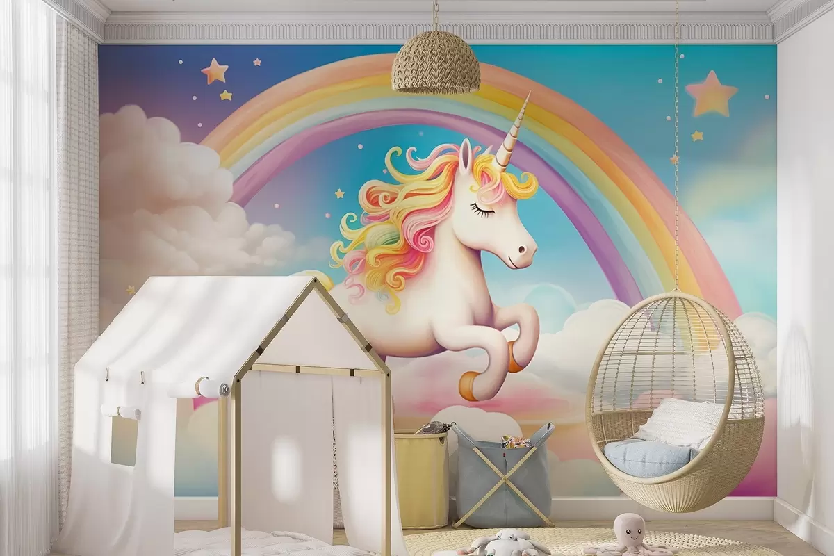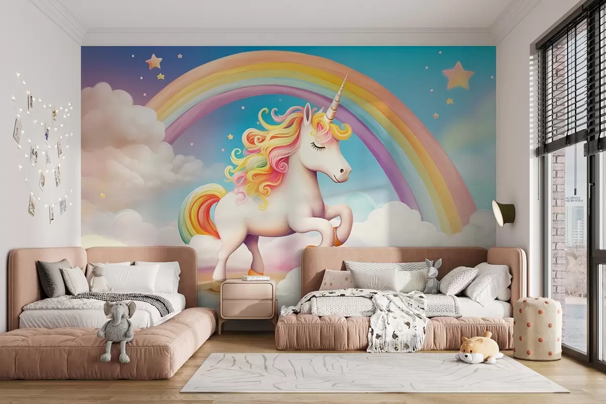 Fototapeten Ein Einhornpferd mit einem Regenbogen, Wolken und einem Sternenhimmel N° w08820