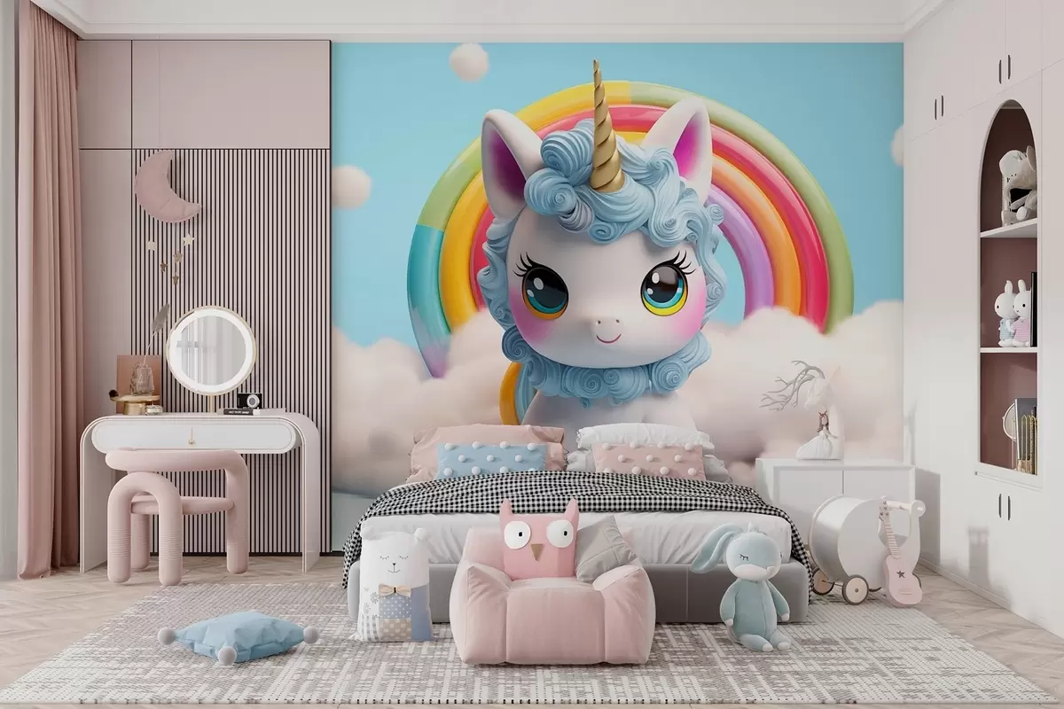 Fototapeten Ein niedliches 3D-Einhorn umgeben von Wolken und einem Regenbogen N° w08848