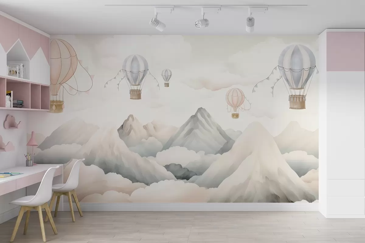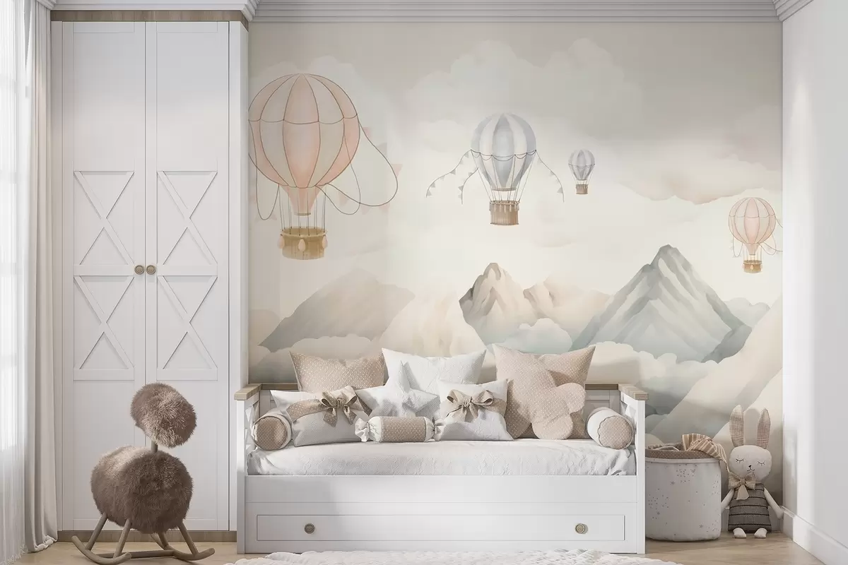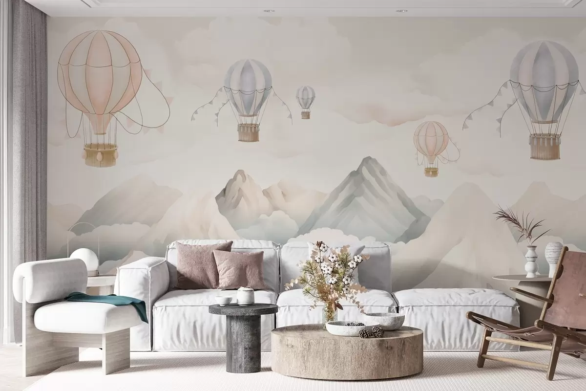 Fototapeten Über den Bergen schwebende Heißluftballons in neutralen, sanften Pastelltönen N° w08853