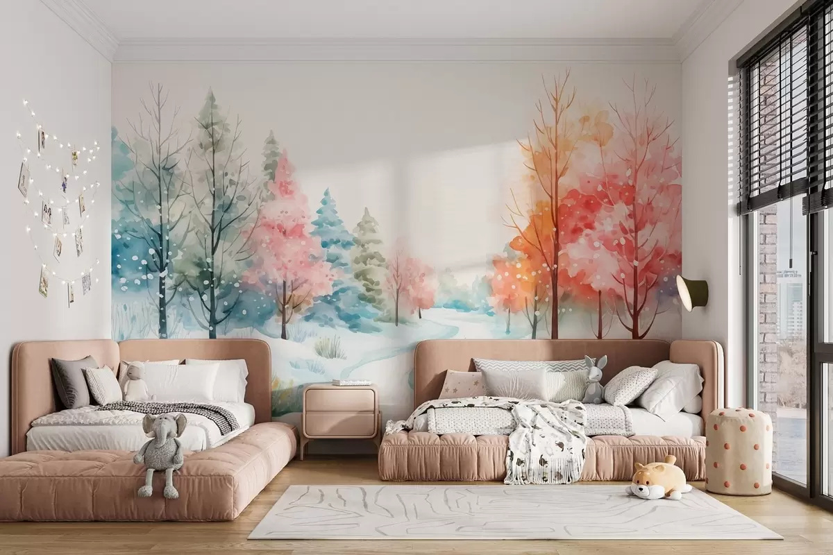 Fototapeten Ein lebendiger Winterwald im Aquarellstil N° w08856