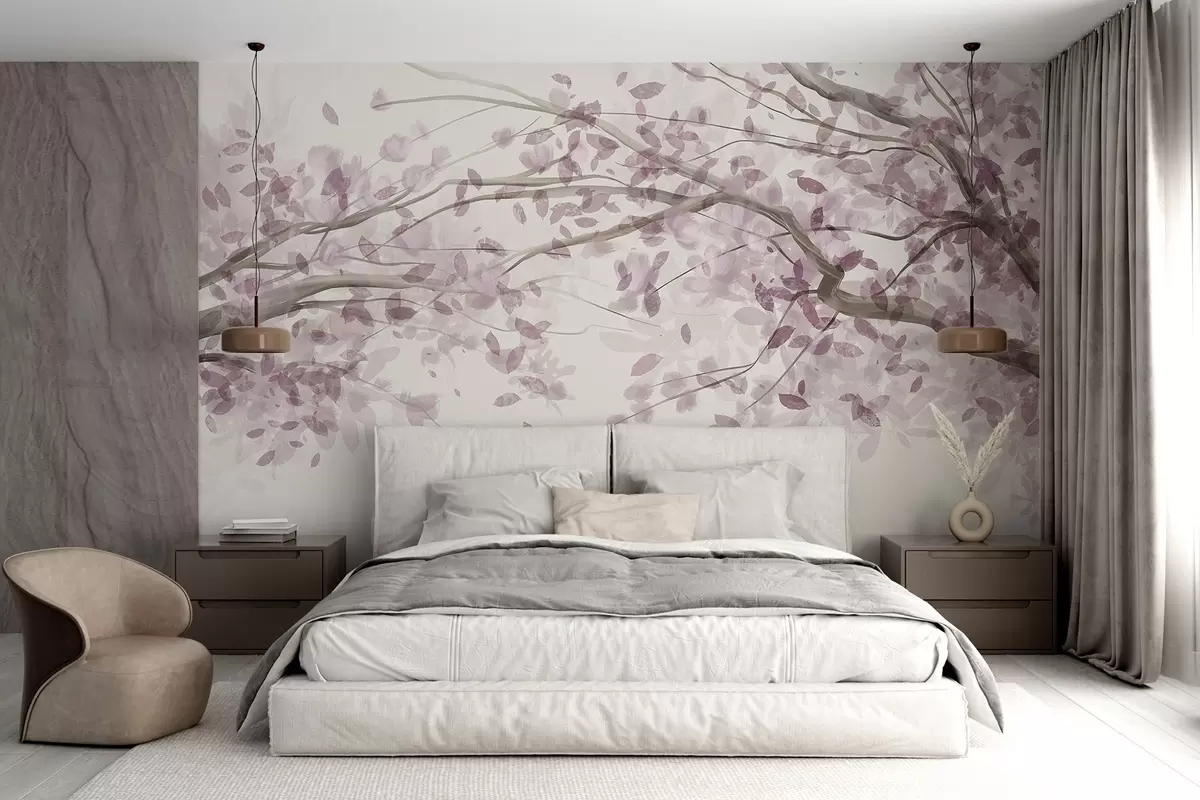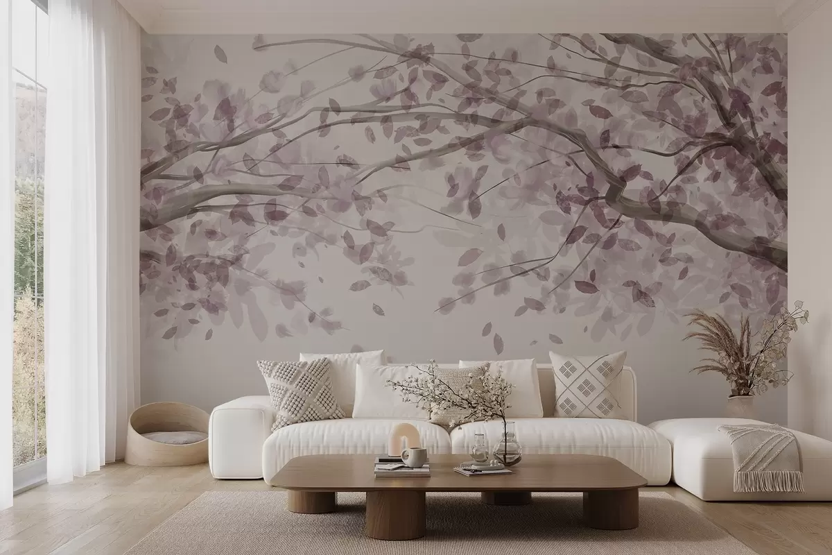 Fototapeten Blossom Zweige mit rosa Blättern, weiche Farben, zarte Details, Aquarell-Stil, vor einem hellen Hintergrund N° w08867