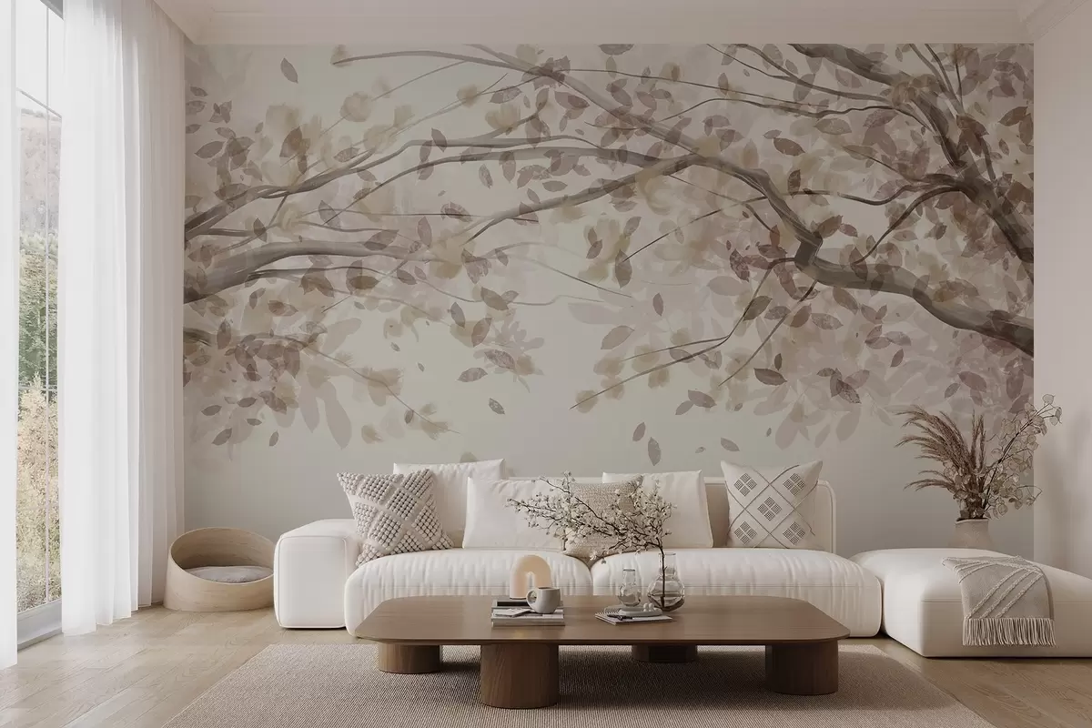 Fototapeten Blütenzweige mit beigen Blättern, weiche Farben, zarte Details, Aquarell-Stil, vor einem hellen Hintergrund N° w08867v1