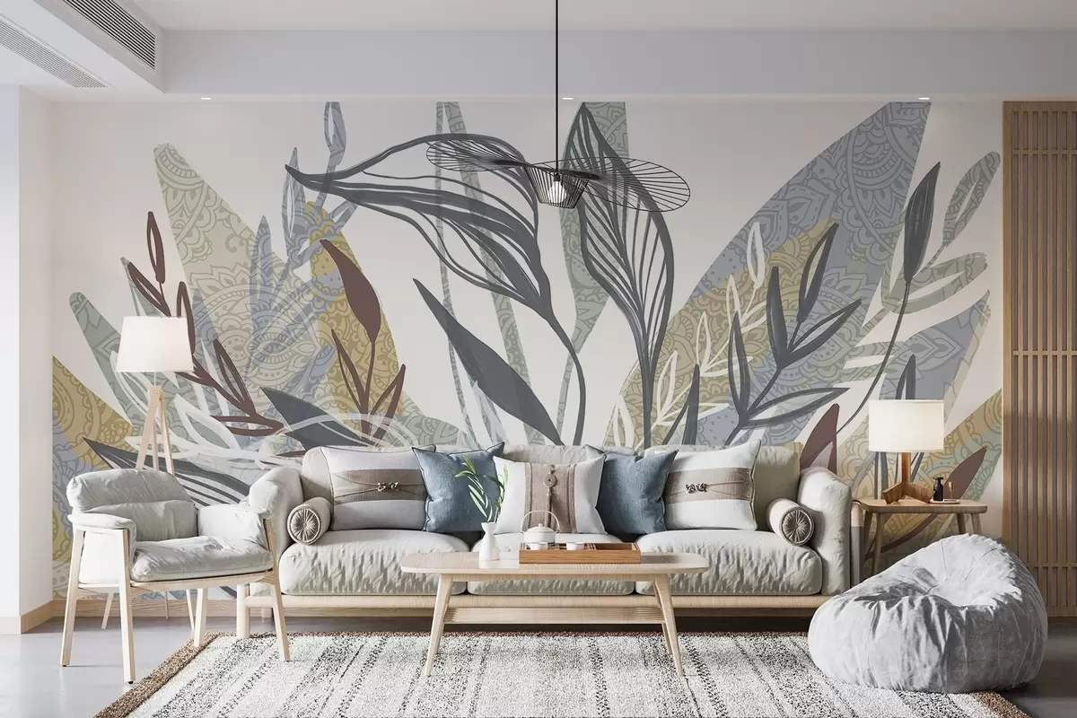 Fototapeten Eine Sammlung von Blättern in verschiedenen Farben und Größen, einige mit Strichzeichnungen, auf einem weißen Hintergrund N° w08893