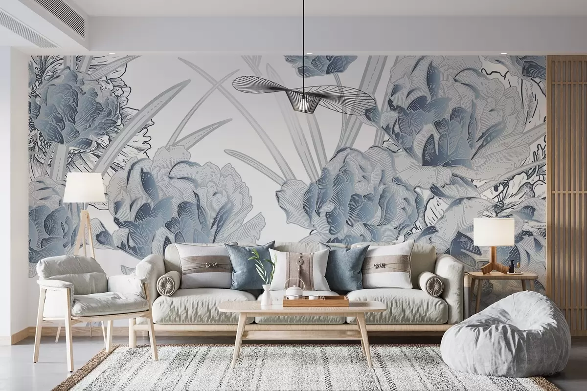 Fototapeten Blaue Pfingstrosen mit Blättern auf weißem Hintergrund, florales Design, botanische Illustration N° w08896