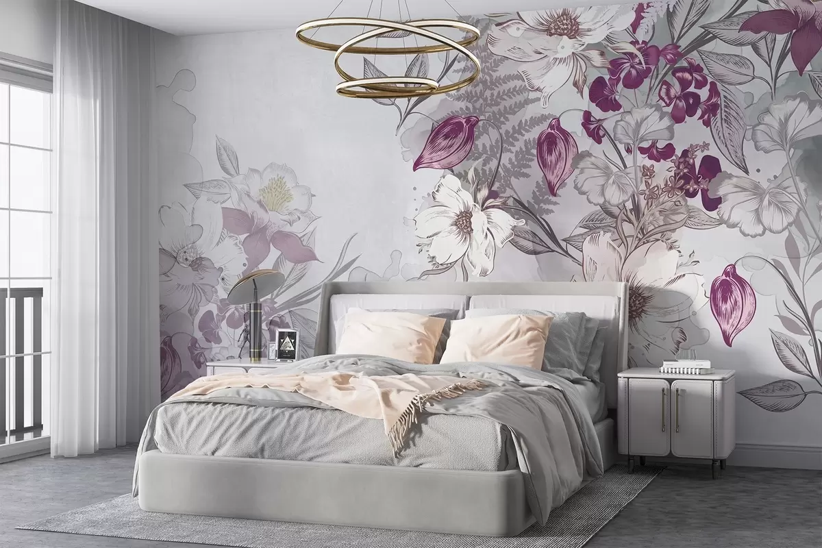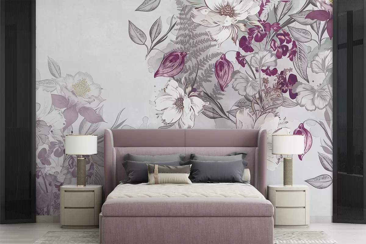 Fototapeten Blumen mit weißen und violetten Blütenblättern, Blättern und Stängeln, Aquarelleffekt, hellgrauer strukturierter Hintergrund N° w08899