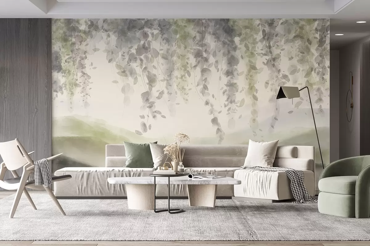 Fototapeten Wisteria Blätter hängen über blauen Bergen, weichen Pastell grün und beige Farben, Aquarell-Stil Landschaft N° w08909v2