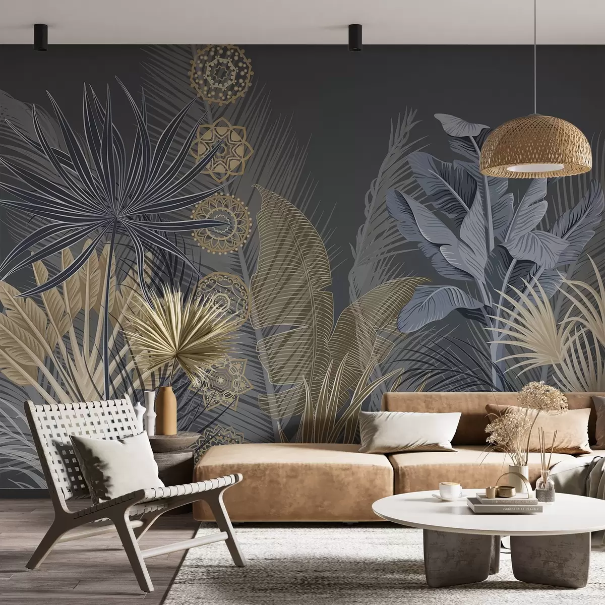 Fototapeten Tropische Blätter in Blau- und Brauntönen, Palmenblätter, Bananenblätter und Mandala-Ornamente, dunkler Hintergrund N° w08913