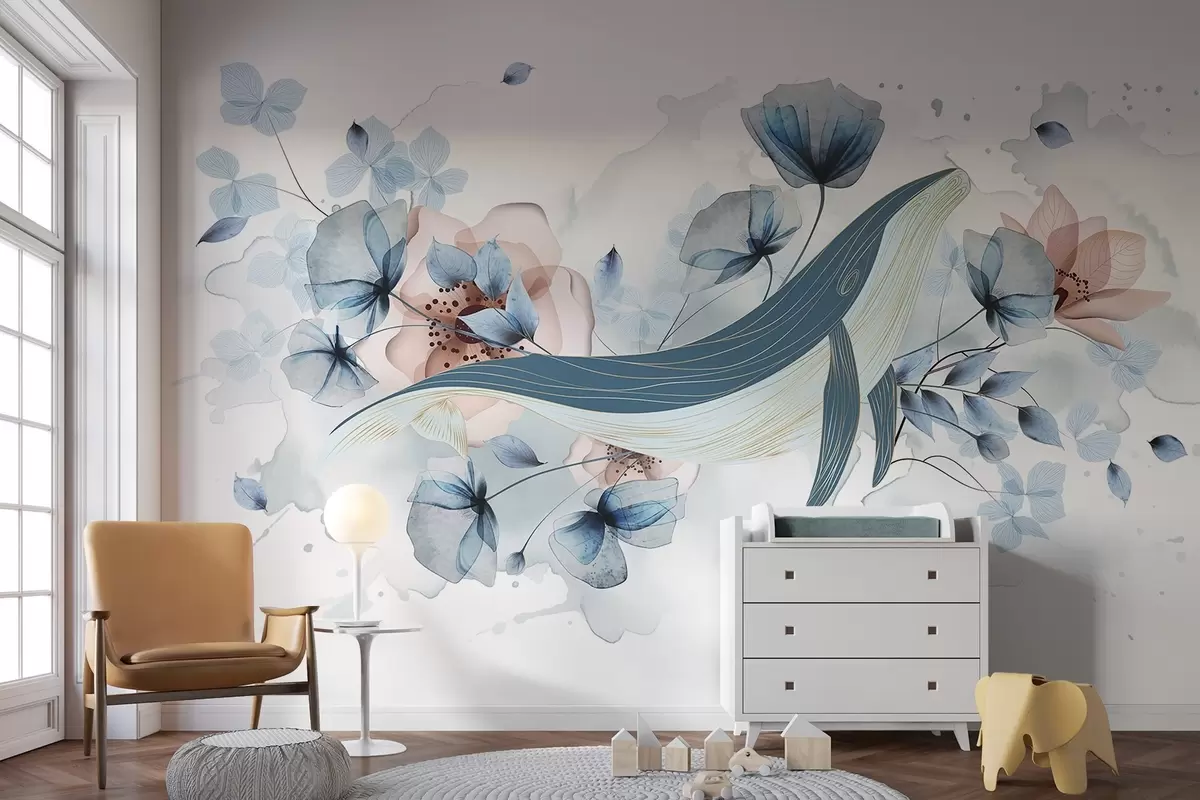 Fototapeten Ein blauer Wal mit Blumen, Aquarell-Stil, hellblau und rosa Farben, hellen Hintergrund N° w08922