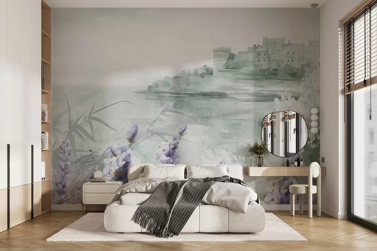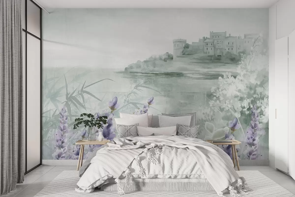 Fototapeten Texturierte Vintage-Landschaft mit einem Schloss auf einer Klippe mit Blick auf das Meer, mit Lavendelblüten in gedeckten Farben N° w08975