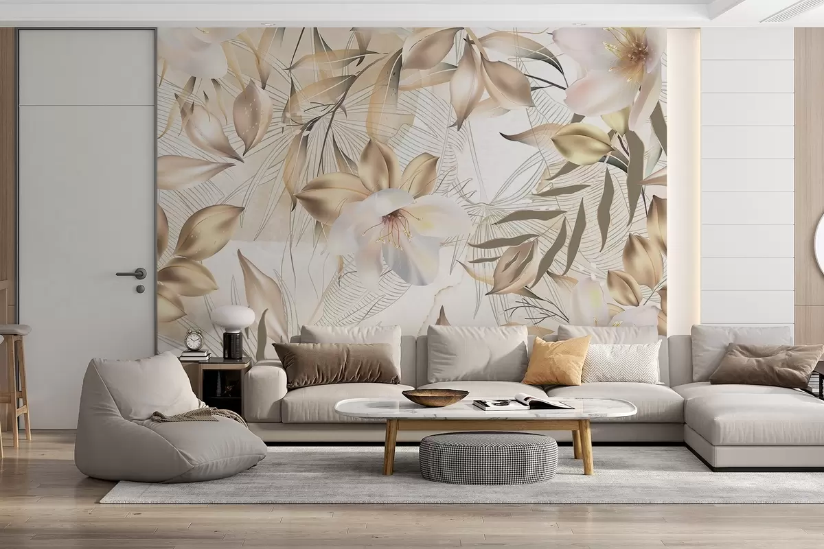 Fototapete Jasminblüten und Blätter, weiche Farben, botanische Illustration, floraler Hintergrund, elegantes Design, zarte Blütenblätter w08977