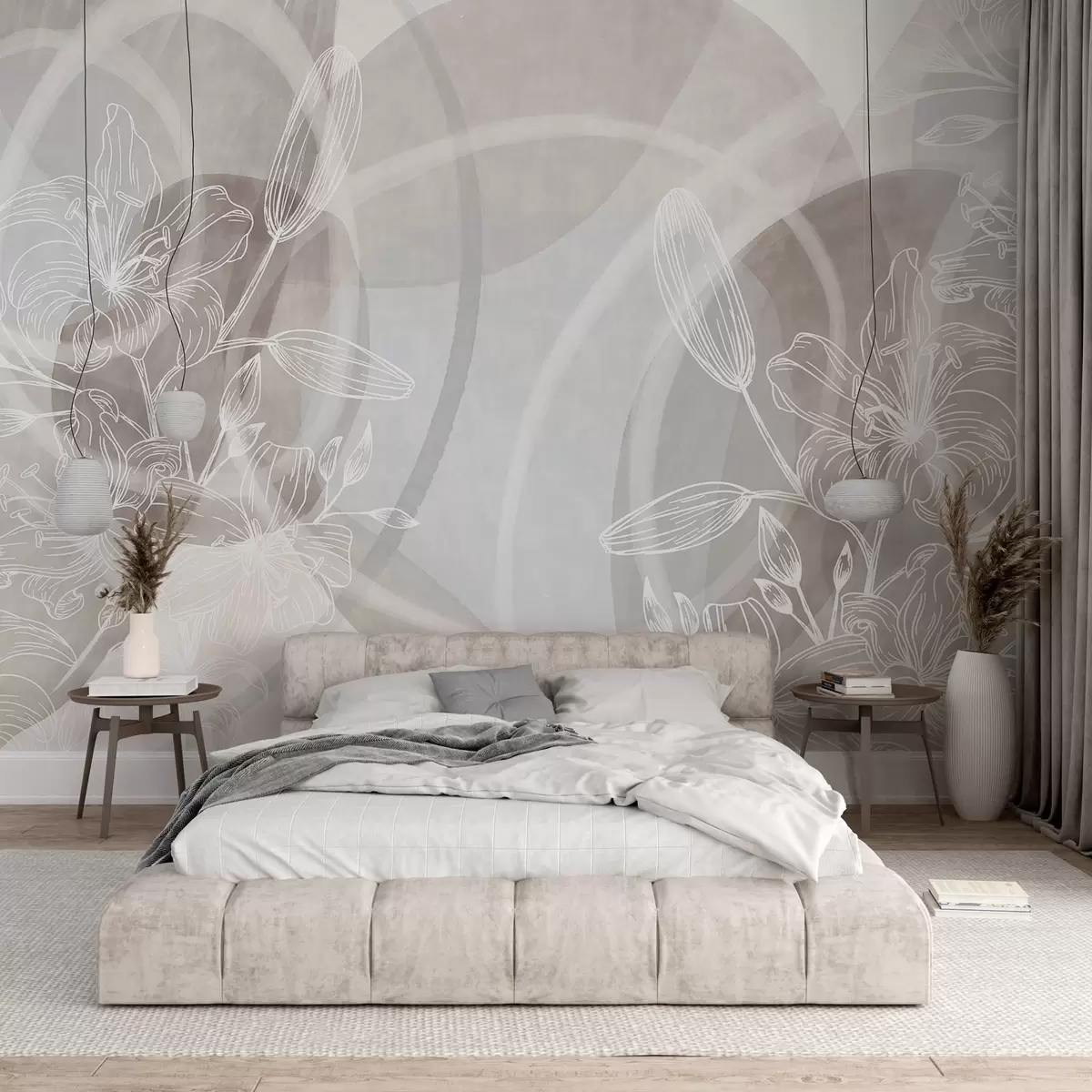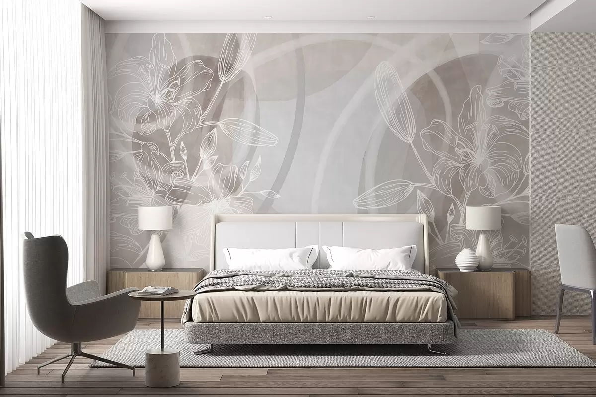 Fototapeten Minimalistisches Blumendesign mit weißen Linienblüten und Blättern, sich überlappende abstrakte Kreise in Beige- und Blautönen N° w08979v1
