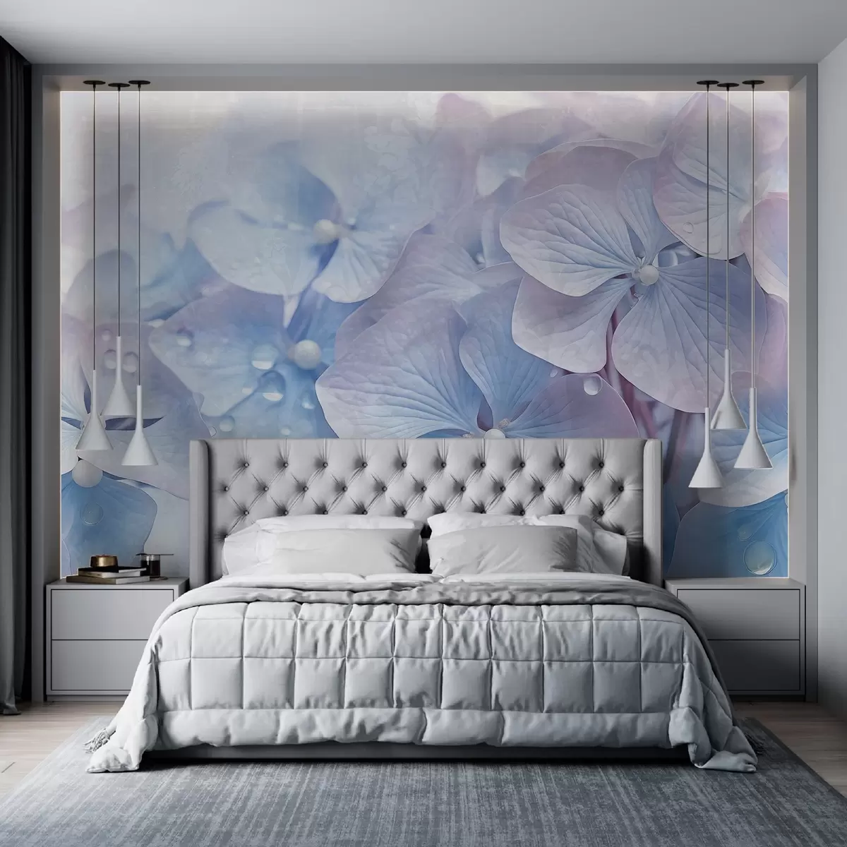 Fototapeten Vintage strukturierte blaue und rosa Hortensienblüten mit Wassertropfen auf den Blütenblättern, verschwommener rosa Hintergrund N° w08981