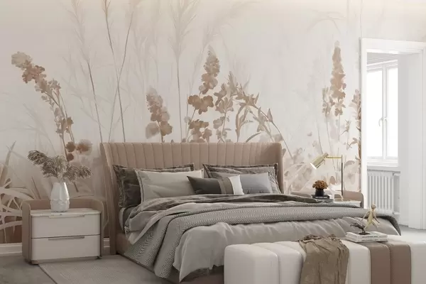 Fototapete Braune Blumen und beige Schilf in einem Feld, minimalistische Malerei Textur, hellen Hintergrund, weiche Farben, zarte Pinselstriche  w08982v1