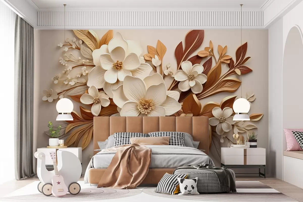 Fototapeten 3D-Blumen mit Blättern im Origami-Stil in Beigetönen N° w08984