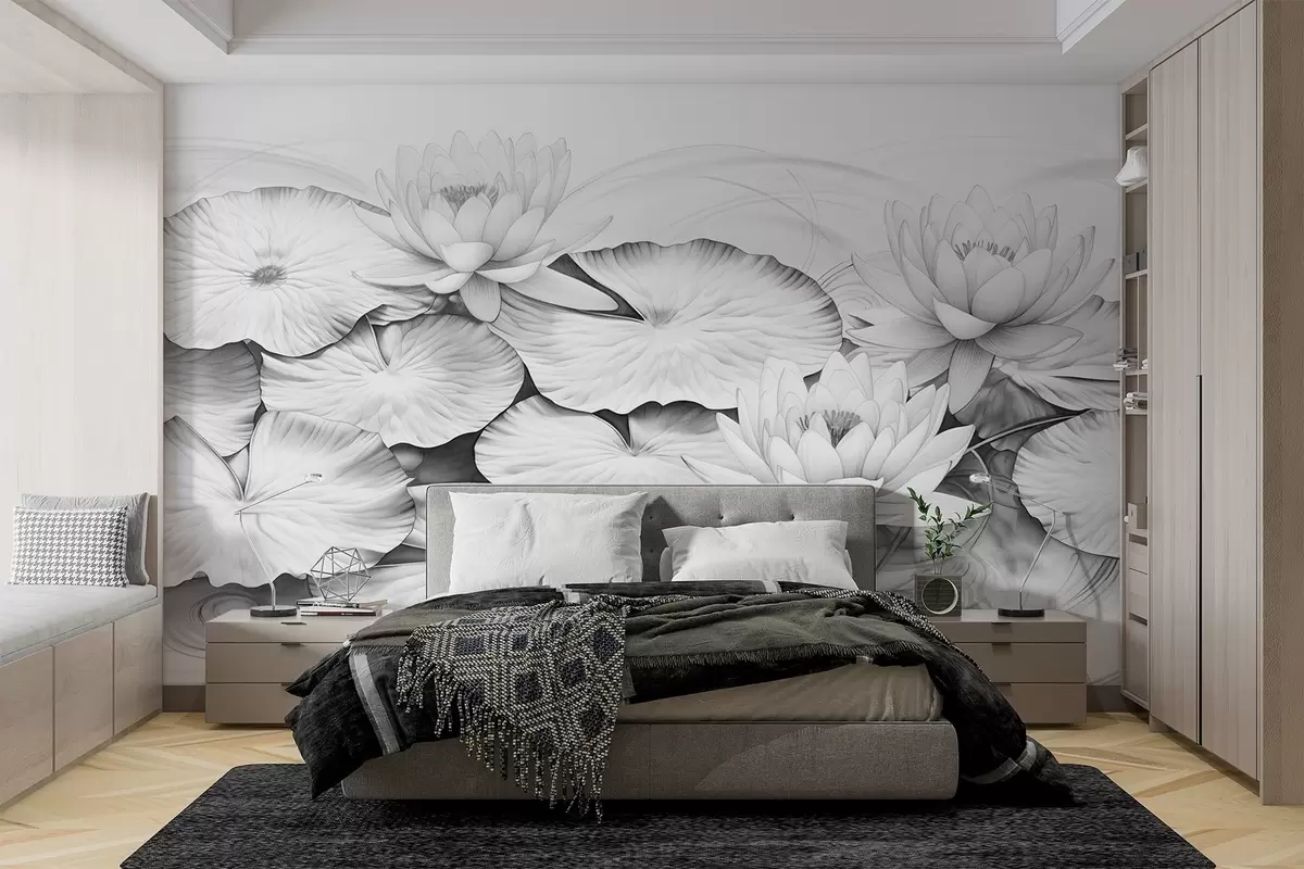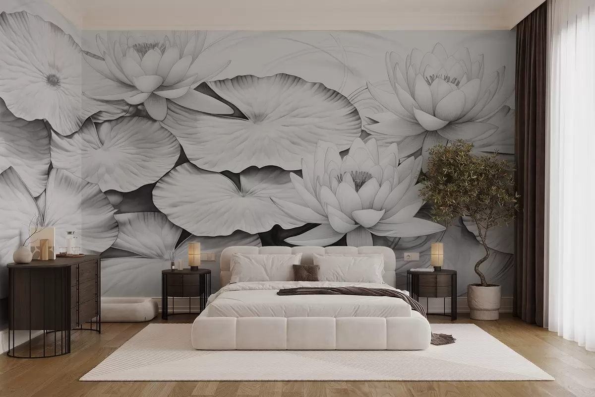 Fototapeten Seerosen und Seerosenblätter in einem Teich, schwarz-weiße Imitation einer Bleistiftzeichnung, detaillierte botanische Illustration, Naturkunst N° w09006