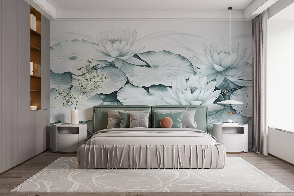 Fototapeten Seerosen und Seerosenblätter in einem Teich, türkis und weiß Nachahmung der Bleistiftzeichnung, detaillierte botanische Illustration, Natur Kunst N° w09006v1