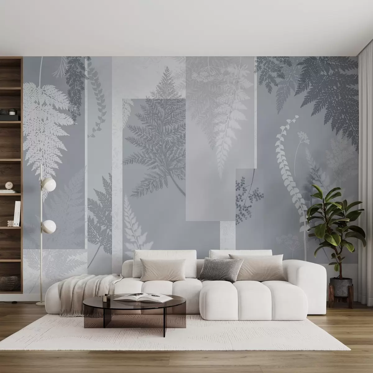 Fototapeten Farnblätter in Blau und Weiß, in vertikalen Streifen angeordnet, wodurch ein botanischer und minimalistischer Druck entsteht, weiche und gedeckte Farben N° w09007v1