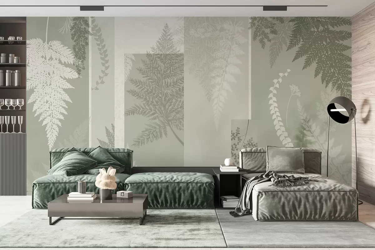 Fototapeten Farnblätter in Grün und Weiß, in vertikalen Streifen angeordnet, wodurch ein botanischer und minimalistischer Druck entsteht, weiche und gedeckte Farben N° w09007v2