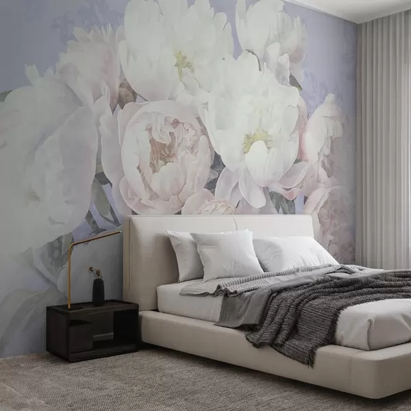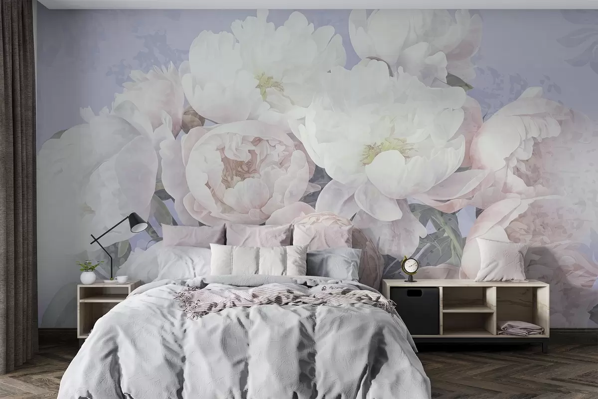 Fototapeten Texturierte abstrakte Pfirsich und weißen Pfingstrosen mit grünen Blättern, hellen Hintergrund, weichen und zarten Farben, Vintage-Stil N° w09008v1