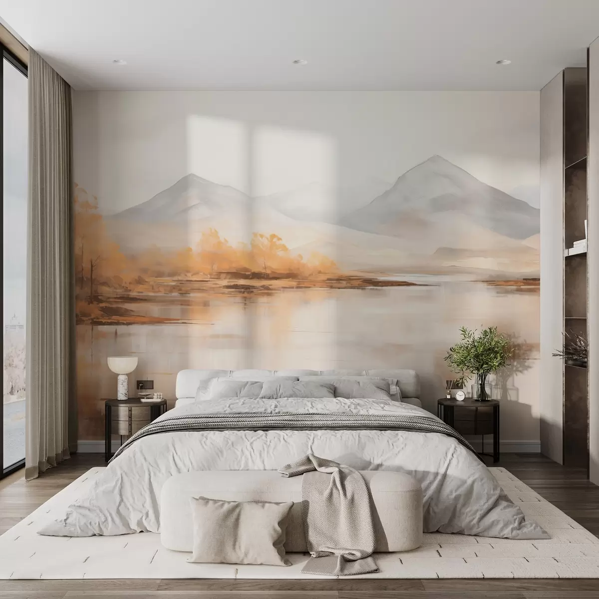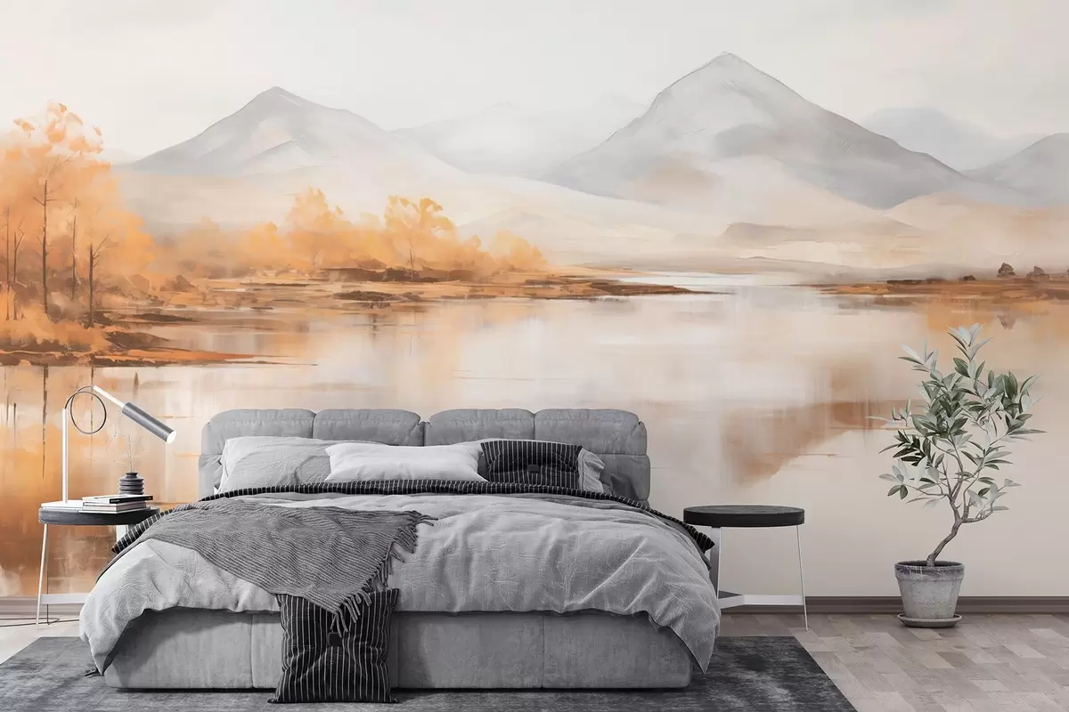 Fototapeten Herbstlandschaft mit gelben Bäumen und einem Fluss vor einem Berghintergrund N° w09020