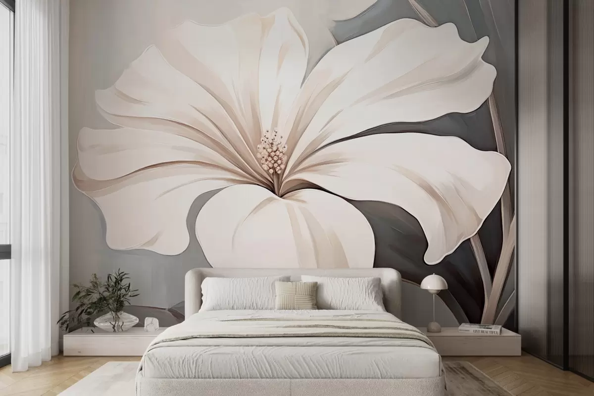 Fototapeten Große weiße Blume mit Blütenblättern auf blau-grauem Hintergrund N° w09033