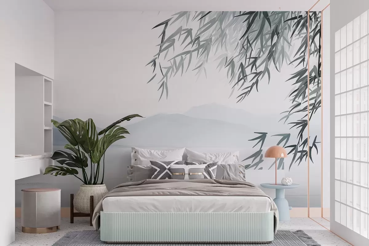 Fototapeten Bambusblätter, die über einem See mit Bergen im Hintergrund hängen, weiche blaue und weiße Töne, Tuschestil N° w09048