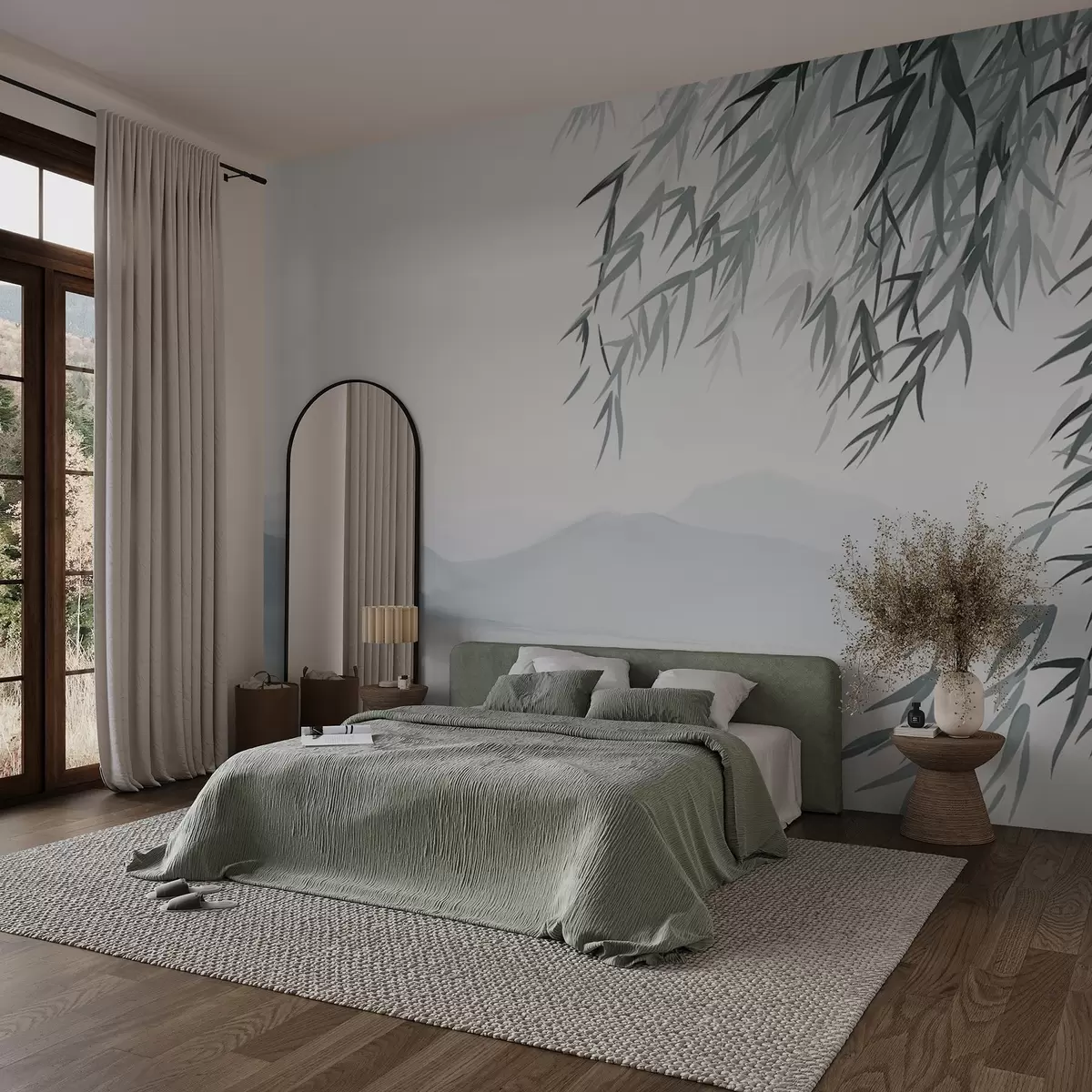 Fototapeten Bambusblätter, die über einem See mit Bergen im Hintergrund hängen, weiche blaue und weiße Töne, Tuschestil N° w09048