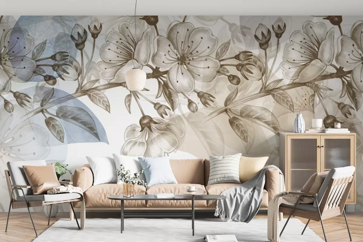 Fototapeten Kirschblütenzweig mit Blüten und Knospen, Sepiatöne, weicher aquarellartiger Hintergrund mit blauen und braunen Farbtönen N° w09051