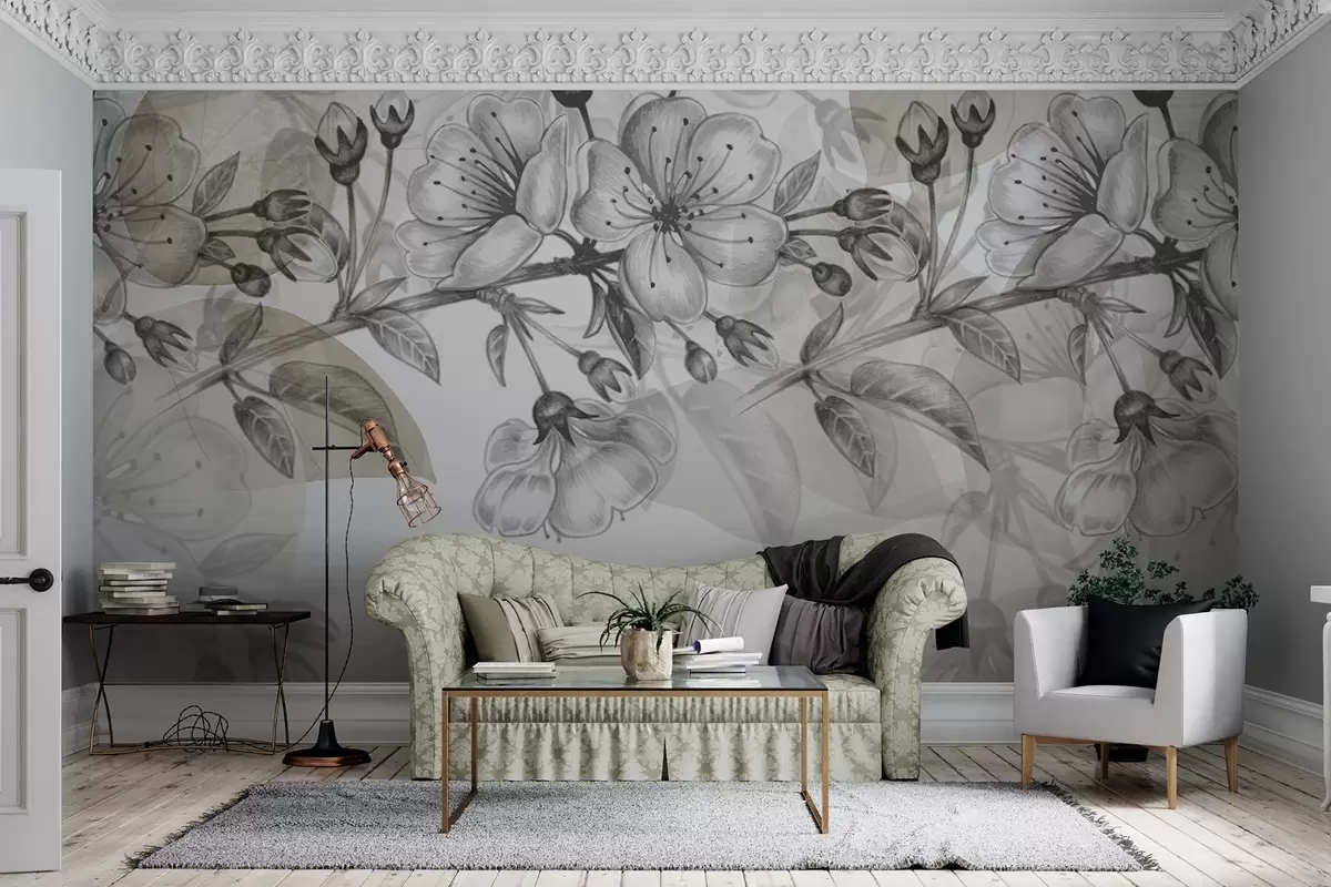 Fototapeten Kirschblütenzweig mit Blüten und Knospen, Sepiatöne, weicher aquarellartiger Hintergrund mit Grau- und Brauntönen N° w09051v1