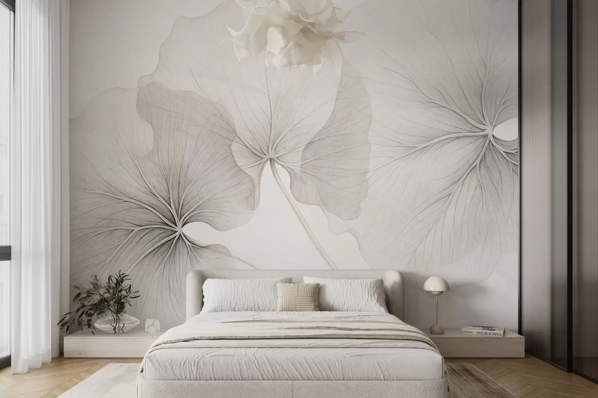 Fototapeten Drei durchscheinende Blätter mit sichtbaren Adern, mit leicht überlappender Rauschtextur, mit dünnen Stielen auf weißem Grund N° w09052