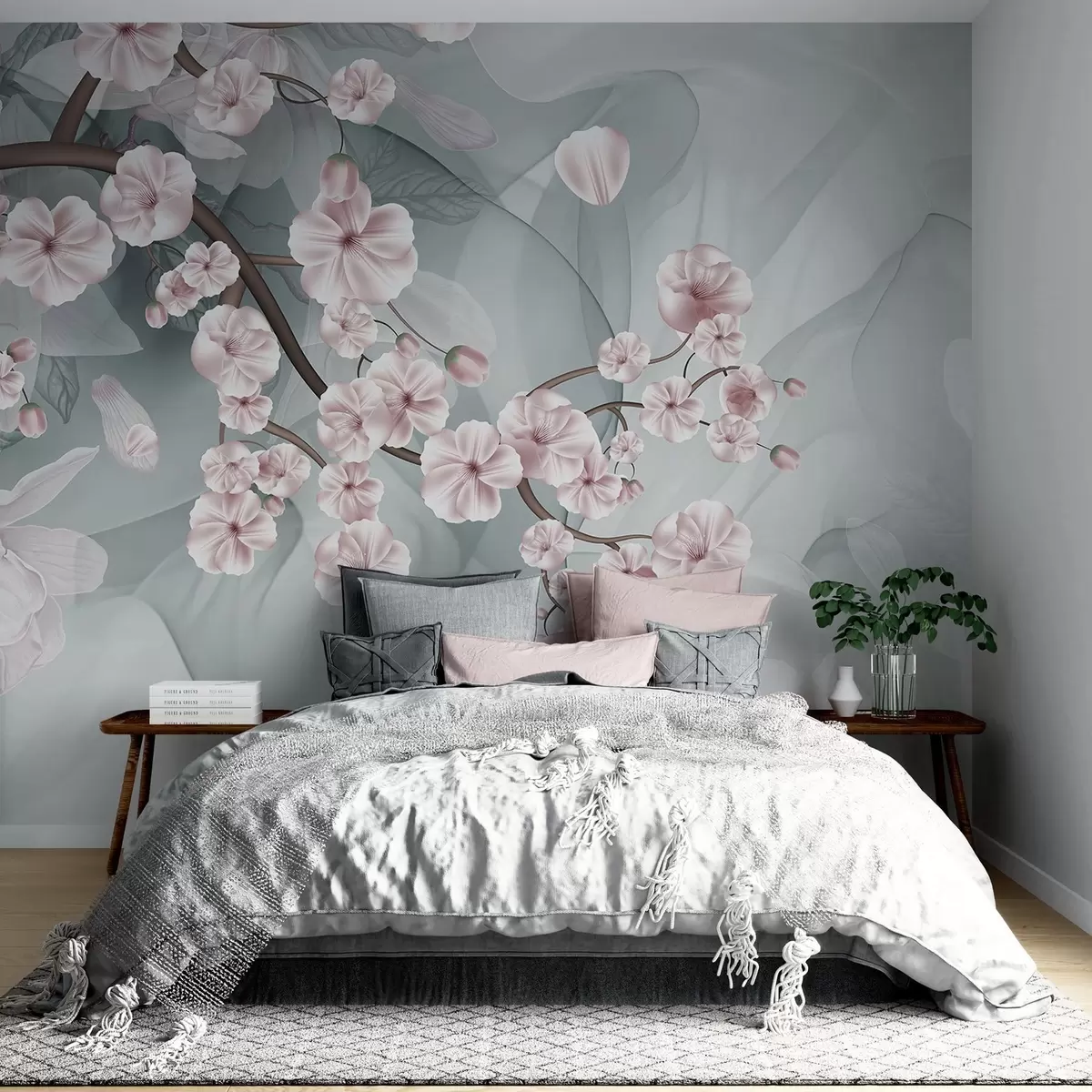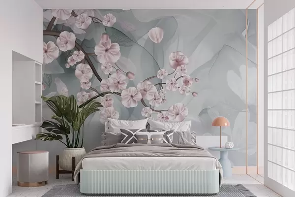 Fototapeten Kirschblütenzweige mit rosa Blüten und Blütenblättern, braune Zweige, abstrakter gedämpfter Hintergrund mit fließendem Effekt N° w09054