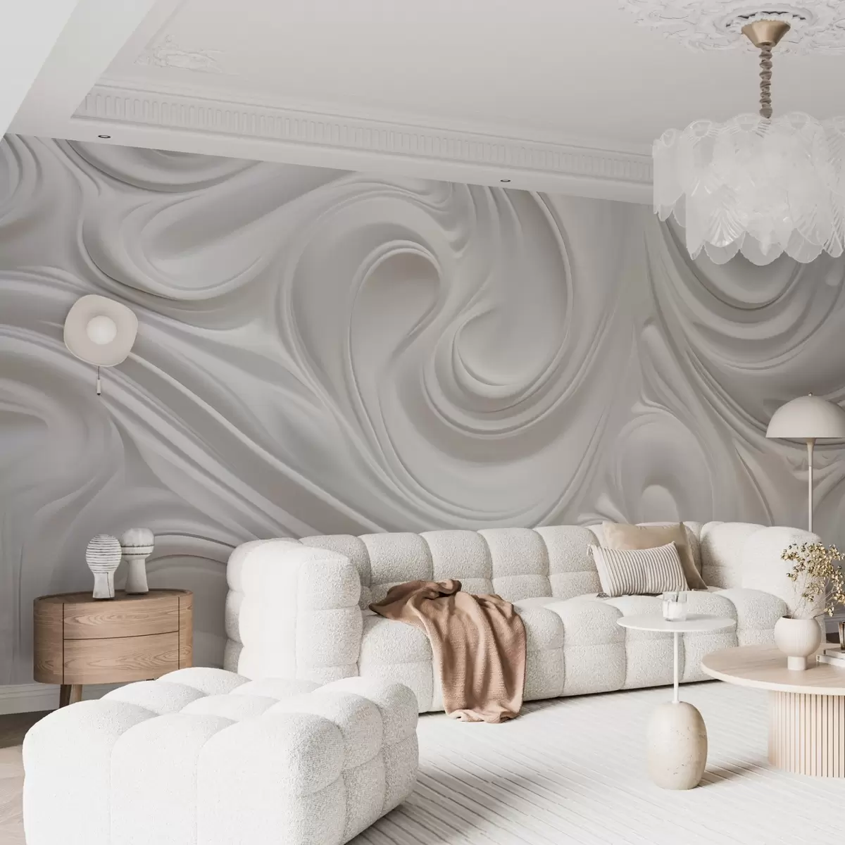 Fototapeten Weiße abstrakte moderne Kunst mit fließenden Wirbeln und Wellen, glatte Textur, elegantes Design, minimalistische Ästhetik N° w09059
