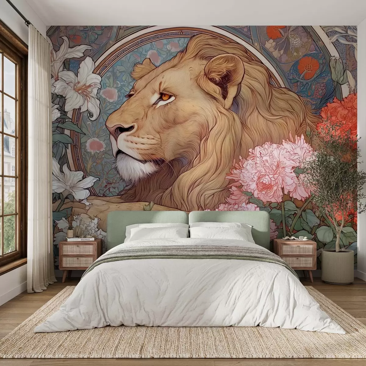 Fototapeten Ein von vielen Blumen umgebener Löwe im Stil von Alphonse Mucha N° w09073