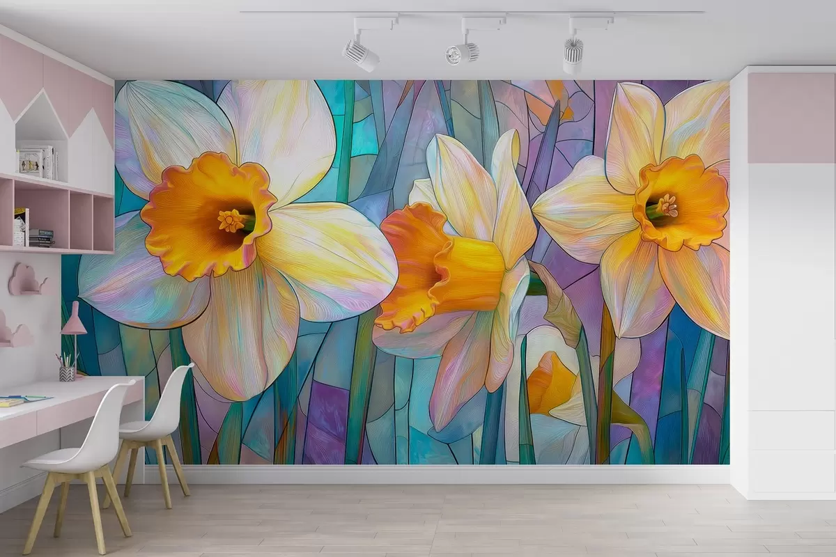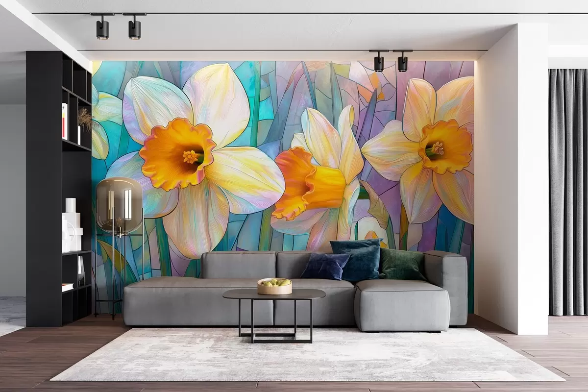 Fototapeten Bunte Narzissen auf einem blau-violetten Hintergrund aus Buntglas N° w09092