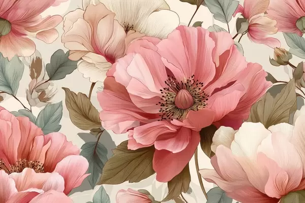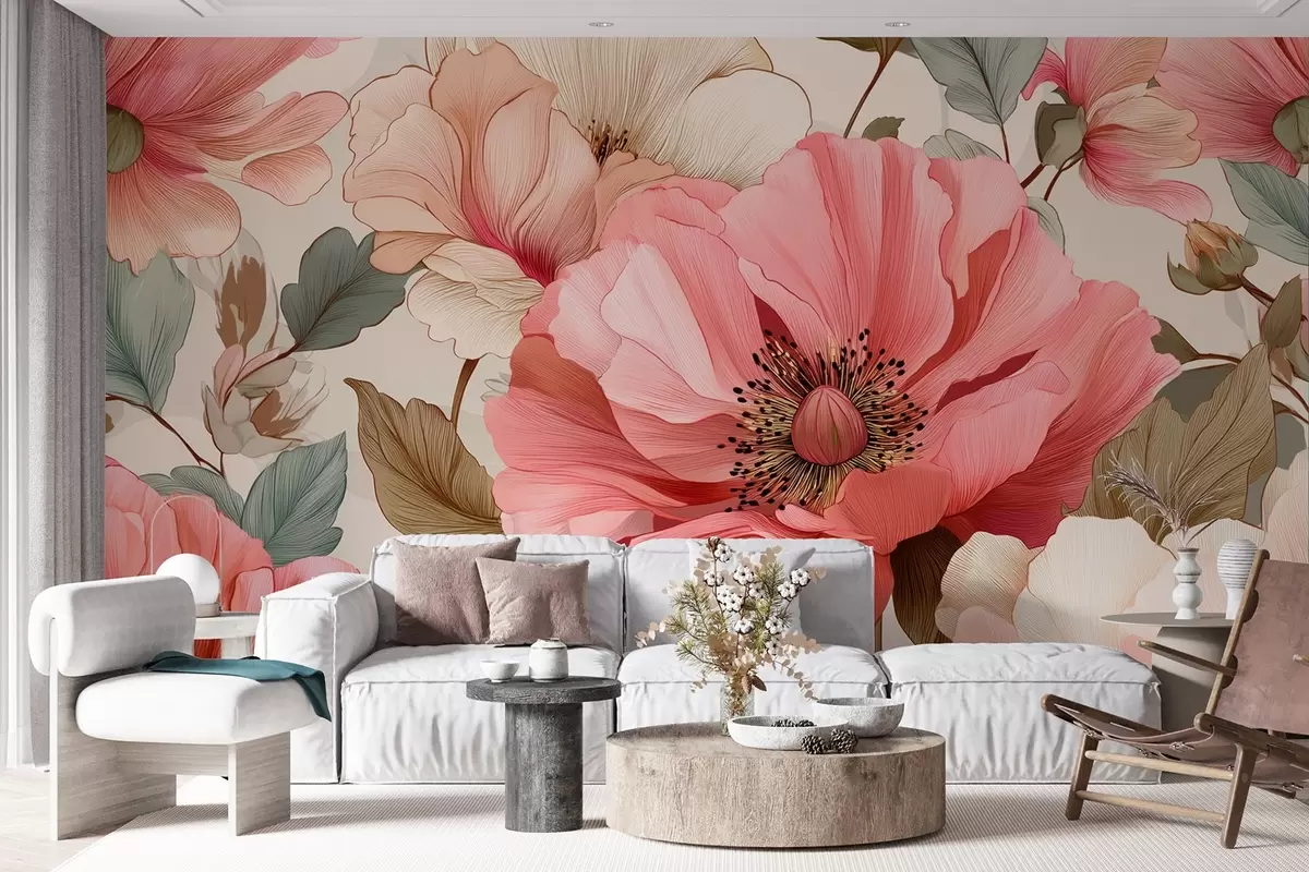 Fototapeten Zarte Mohnblumen mit Blättern in rot-rosa Tönen N° w09100