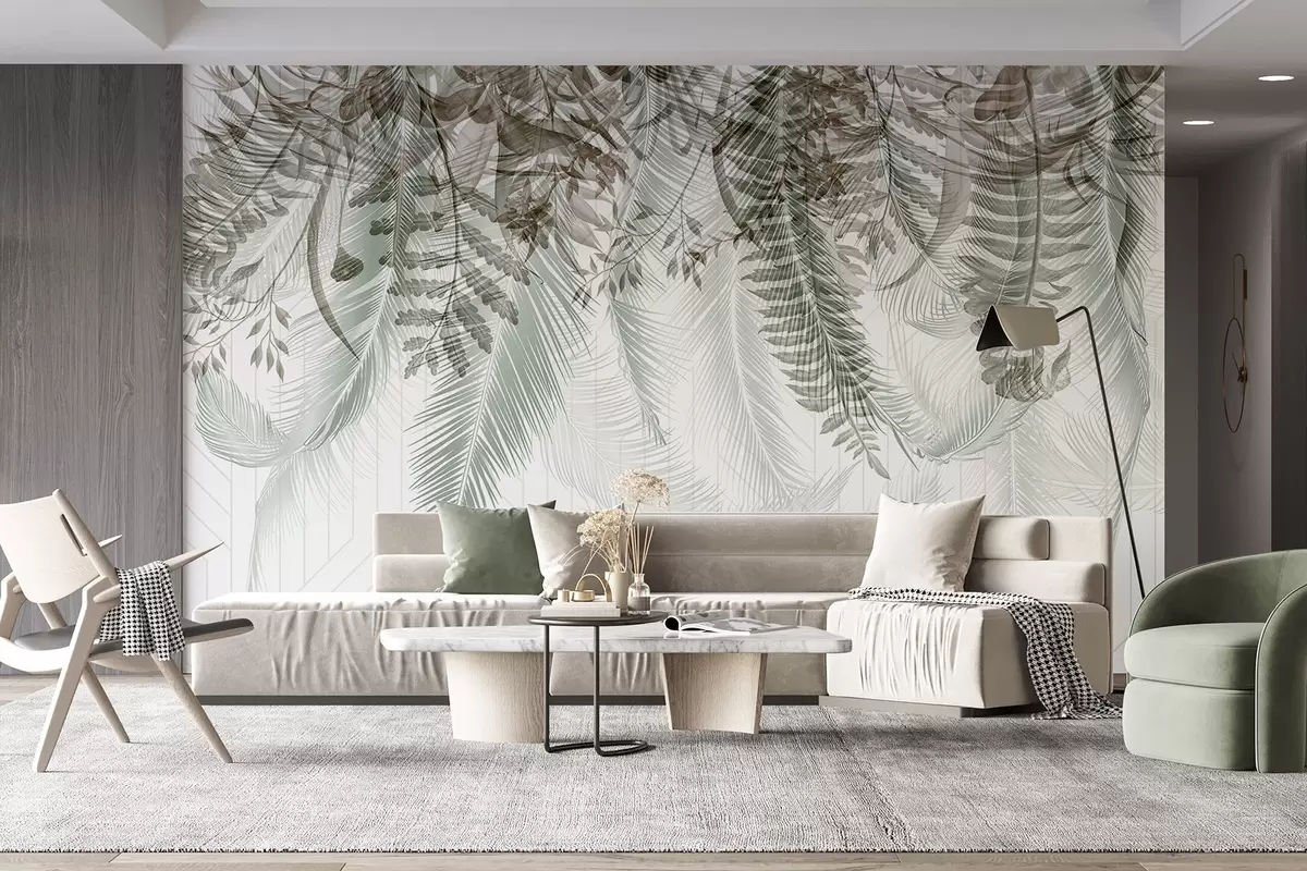 Fototapeten Zarte fallende tropische Farn- und Palmenblätter, geometrischer Hintergrund, weiches Licht, gedämpfte Farben, elegant N° w09106v1