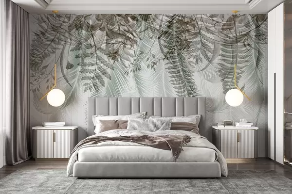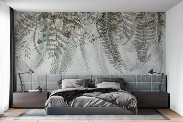 Fototapeten Zarte fallende tropische Farn- und Palmenblätter, geometrischer Hintergrund, weiches Licht, gedämpfte Farben, elegant N° w09106v1