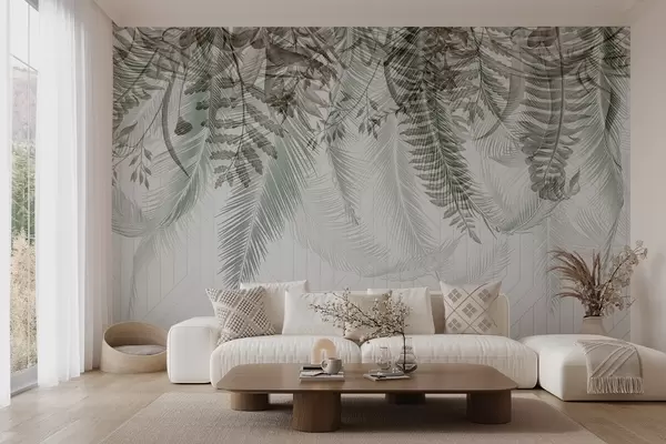 Fototapeten Zarte fallende tropische Farn- und Palmenblätter, geometrischer Hintergrund, weiches Licht, gedämpfte Farben, elegant N° w09106v1
