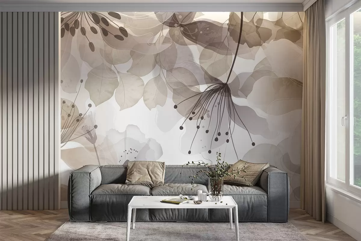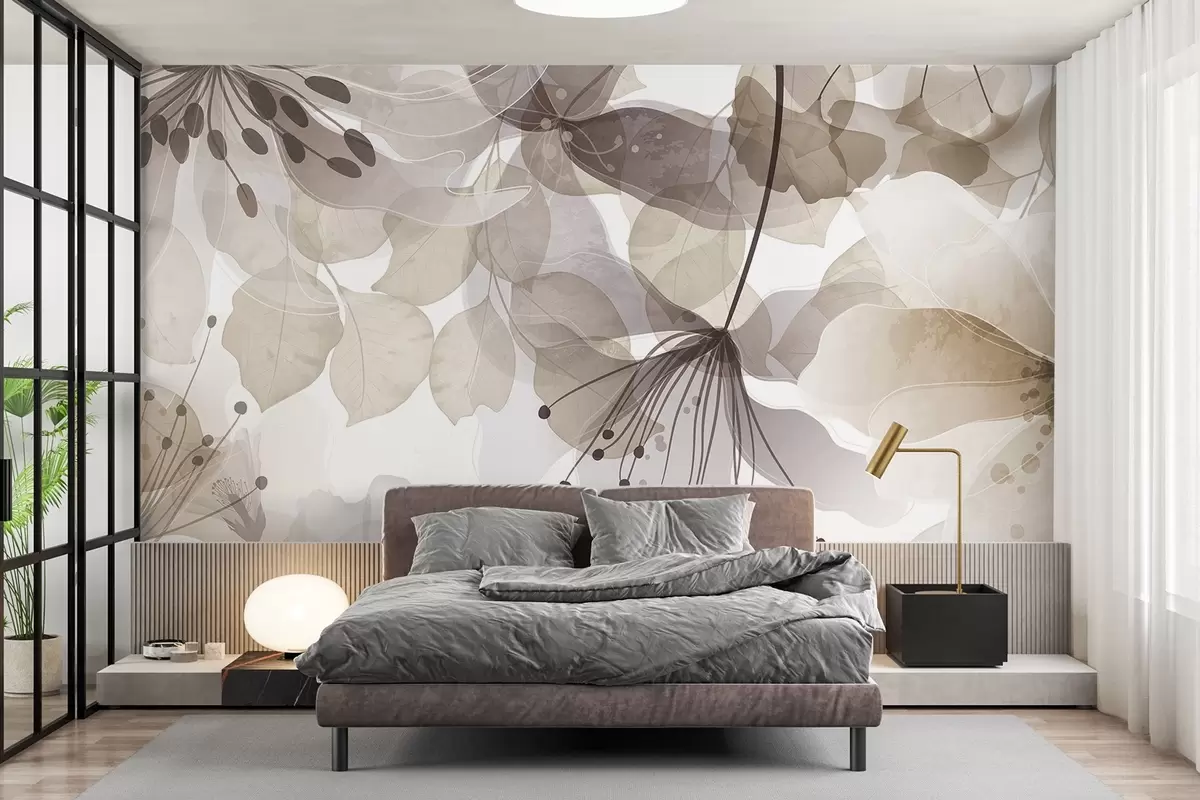 Fototapeten Blumen und Blätter in Beigetönen, durchscheinende Blütenblätter und Blätter, weicher Aquarelleffekt, zarte Linien, weißer Hintergrund N° w09107v1