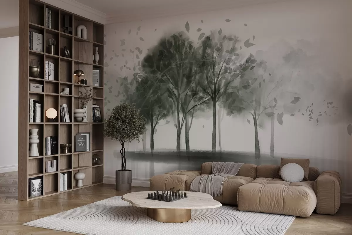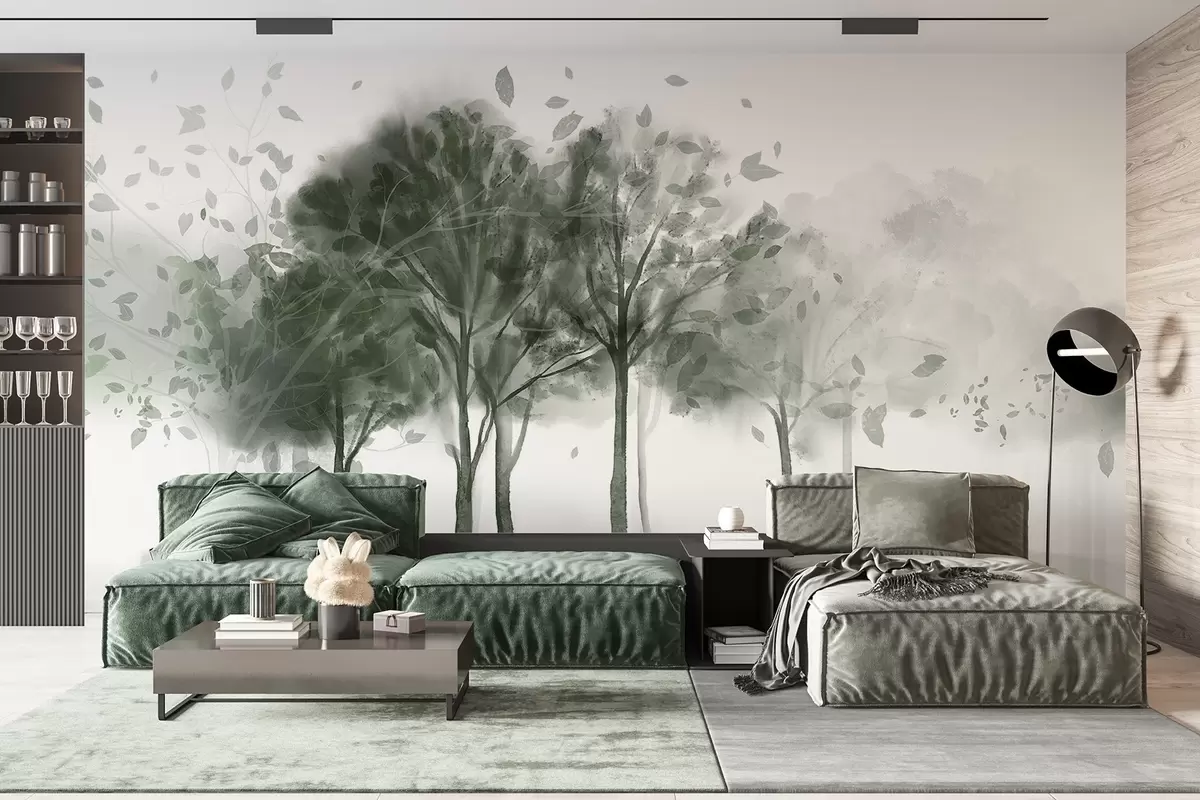 Fototapeten Abstrakte Landschaft mit Bäumen mit grünen Blättern, die sich im Wasser spiegeln, in Aquarell strukturierten Stil N° w09109