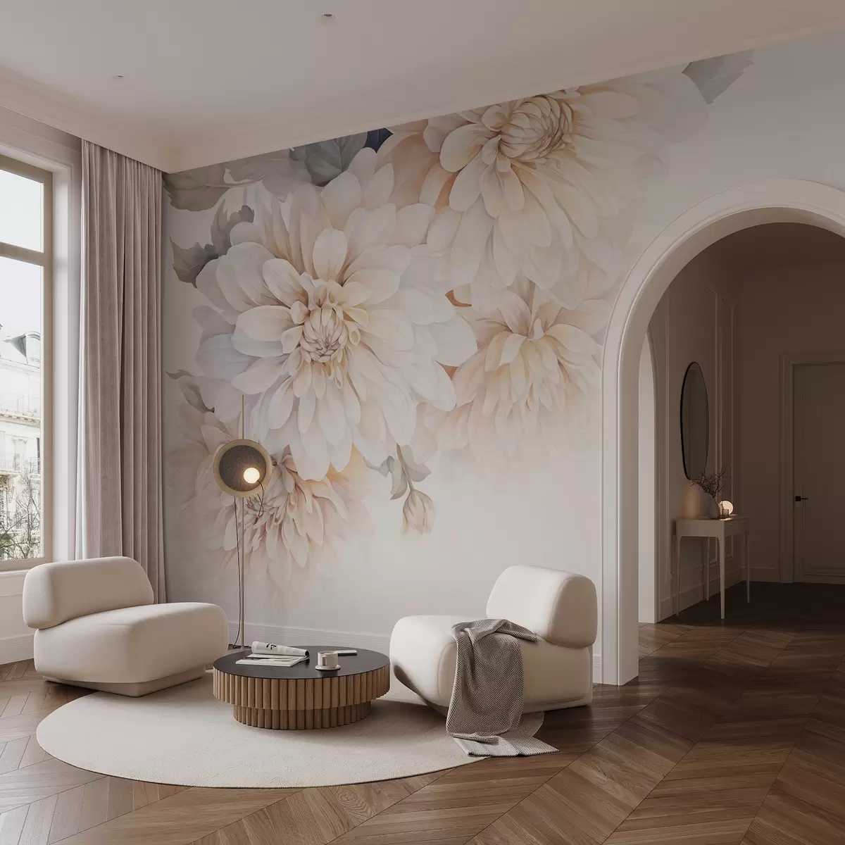 Fototapeten Pastellfarbene Dahlien mit weichen, zarten pfirsichfarbenen und weißen hellen Blütenblättern im Aquarellstil, weicher Hintergrund N° w09115