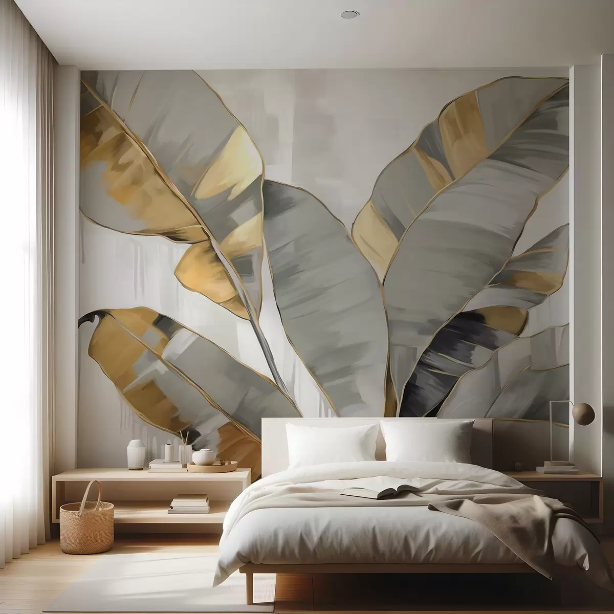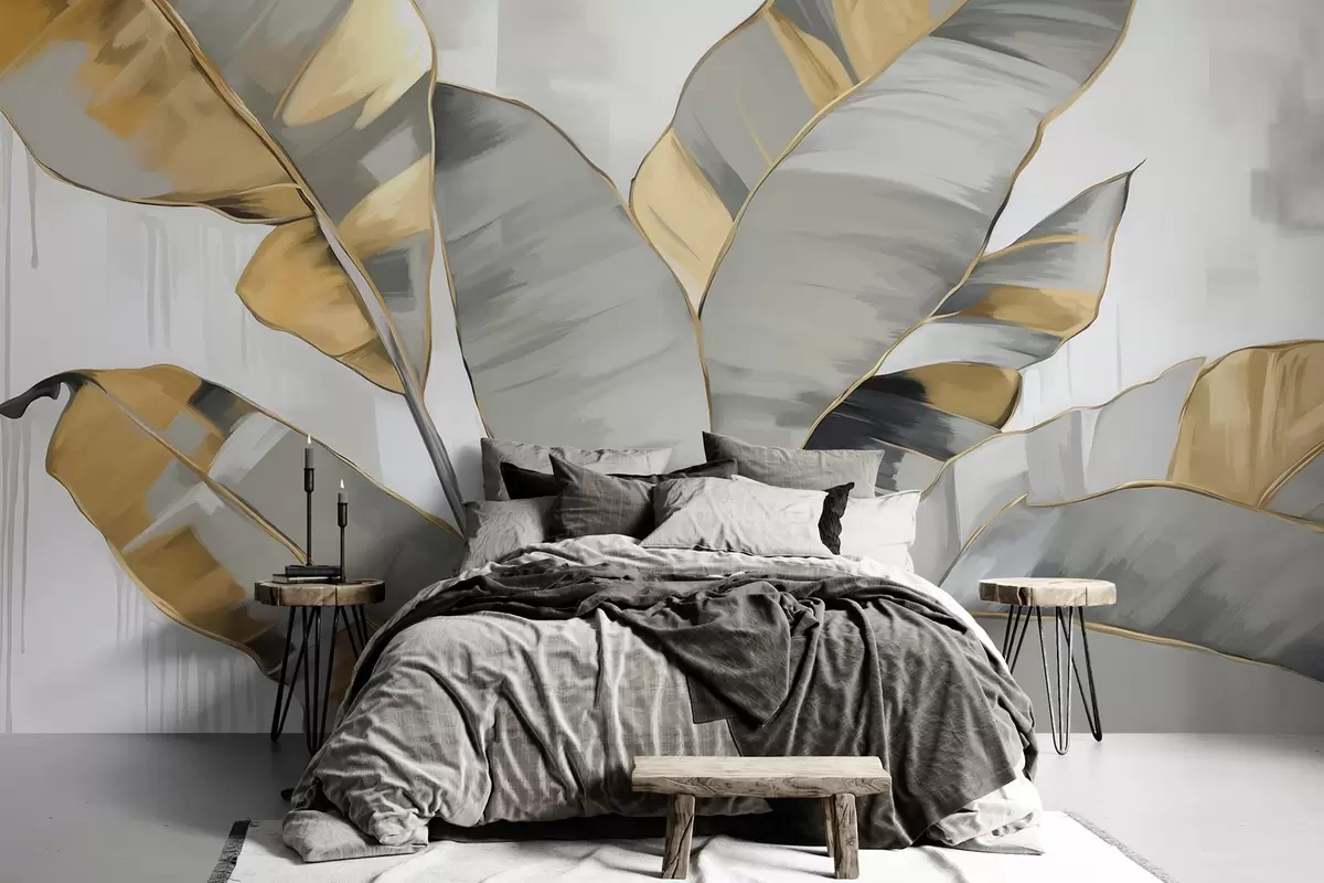 Fototapeten Banane tropische strukturierte Blätter mit grauen und gelben Tönen, modernen Stil, neutralen Hintergrund, dekorative Malerei N° w09118