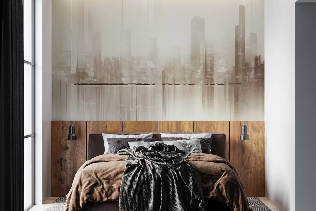 Fototapeten Abstrakte, strukturierte Stadtlandschaft mit hohen Gebäuden und Streifen in Beige- und Weißtönen, die einen dunstigen Effekt erzeugen N° w09119v1