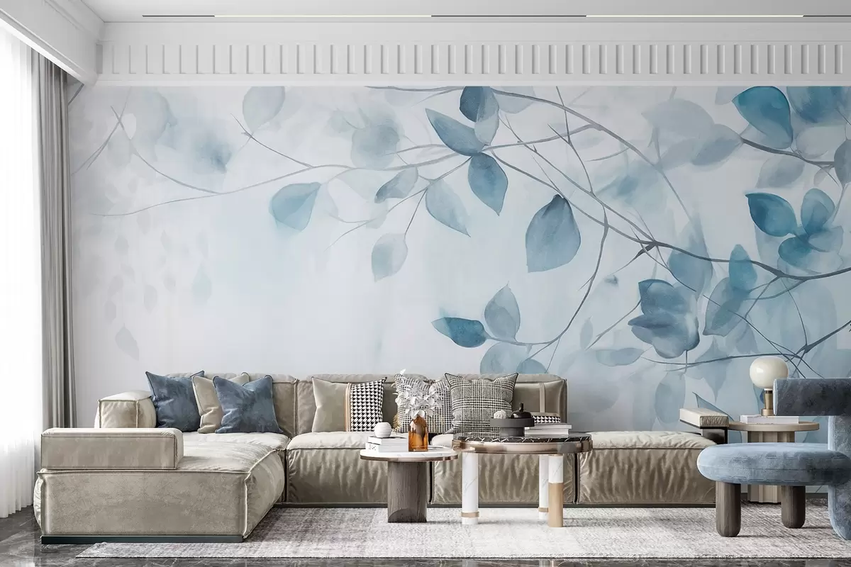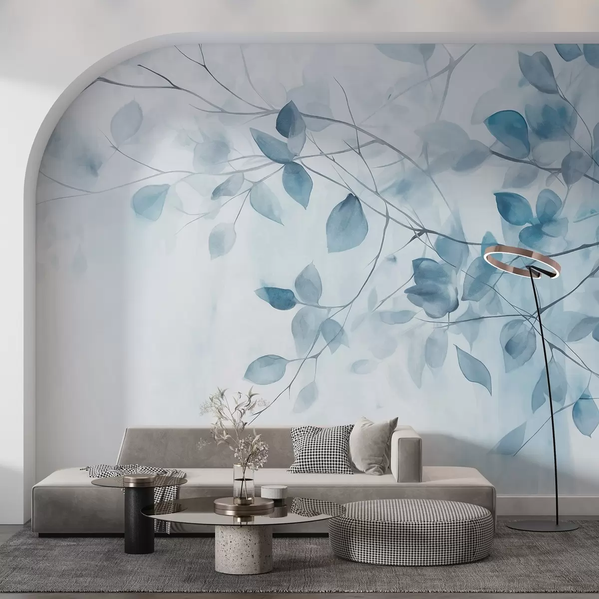 Fototapeten Texturale Aquarellmalerei Nachahmung von blauen Blättern und Zweigen, weiche Farben, zarte Details vor weißem Hintergrund N° w09133v1