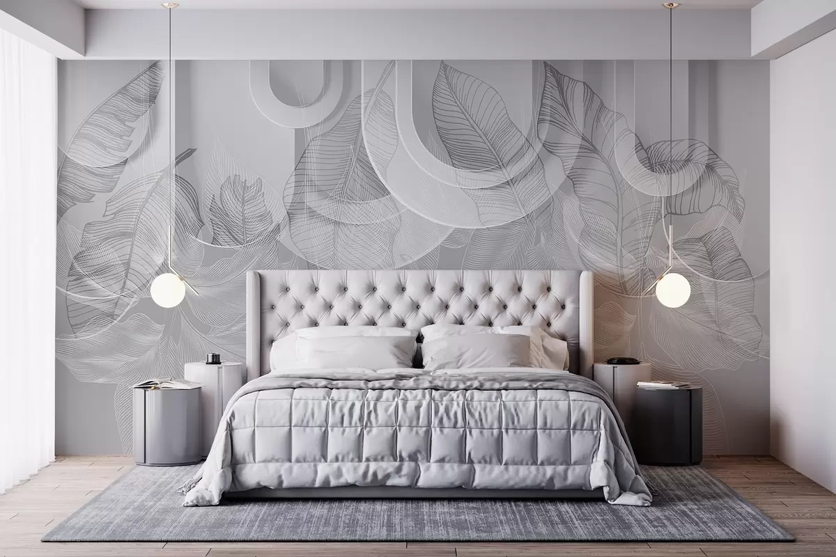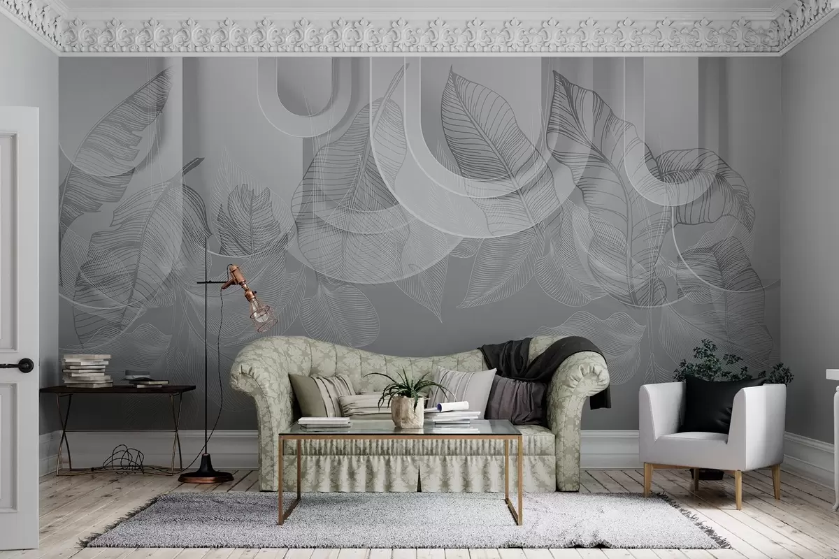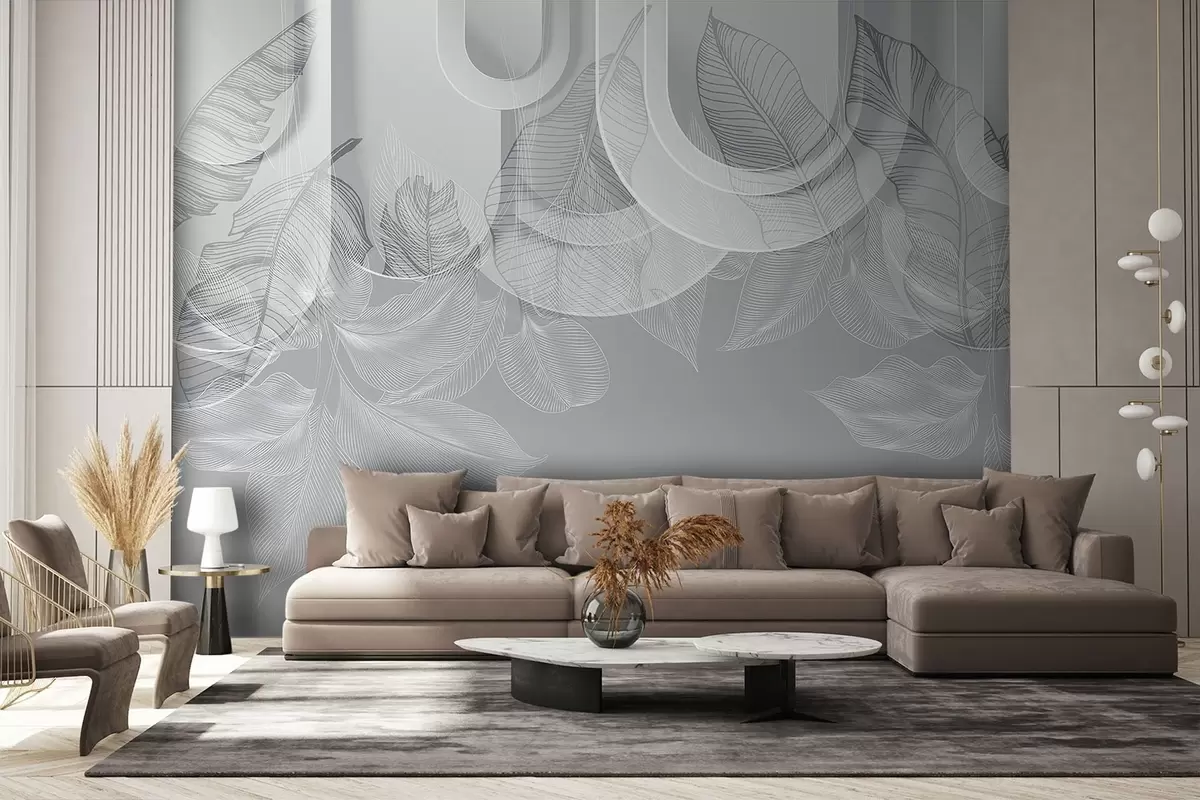 Fototapeten Abstrakter Hintergrund mit grauen Bögen und weißen tropischen Blättern, minimalistisches Design, elegant und modern, neutrale Farbpalette N° w09138